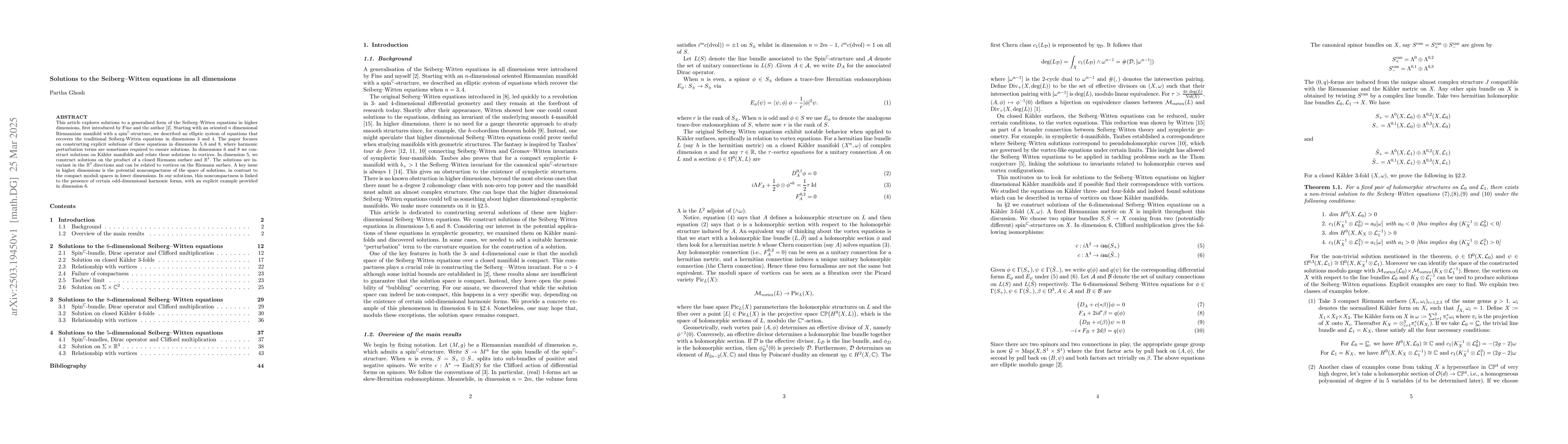 This article explores solutions to a generalised form of the Seiberg--Witten equations in higher dimensions, first introduced by Fine and the author. Starting with an oriented $n$ dimensional Riemannian manifold with a spin$^\mathbb{C}$-structure, we described an elliptic system of equations that recovers the traditional Seiberg-Witten equations in dimensions $3$ and $4$. The paper focuses on constructing explicit solutions of these equations in dimensions $5, 6$ and $8$, where harmonic perturbation terms are sometimes required to ensure solutions. In dimensions $6$ and $8$ we construct solutions on K\"ahler manifolds and relate these solutions to vortices. In dimension $5$, we construct solutions on the product of a closed Riemann surface and $\mathbb{R}^3$. The solutions are invariant in the $\mathbb{R}^3$ directions and can be related to vortices on the Riemann surface. A key issue in higher dimensions is the potential noncompactness of the space of solutions, in contrast to the compact moduli spaces in lower dimensions. In our solutions, this noncompactness is linked to the presence of certain odd-dimensional harmonic forms, with an explicit example provided in dimension $6$.
