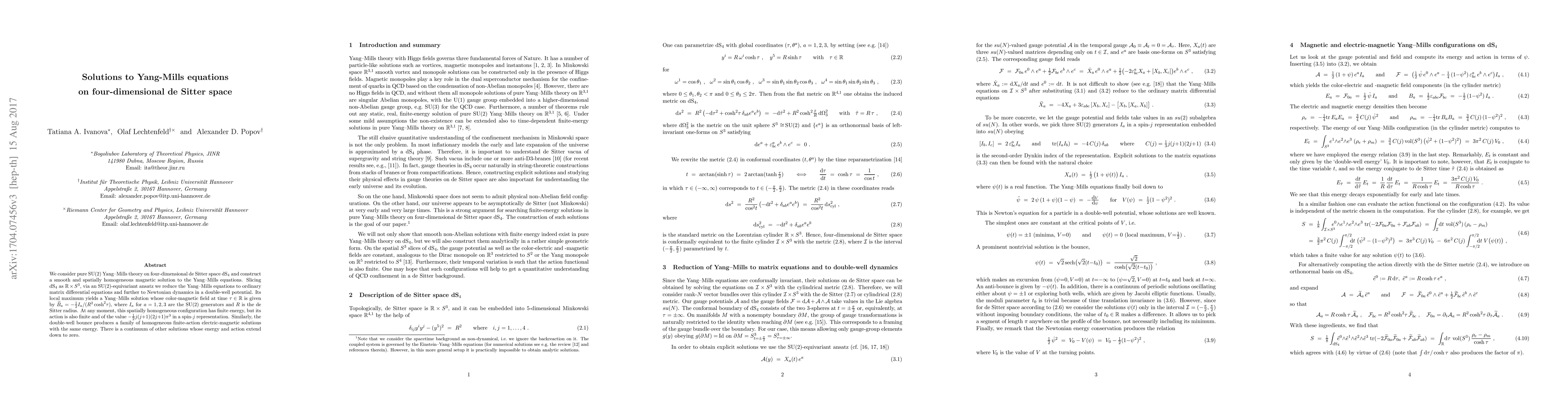 This paper constructs a smooth, spatially homogeneous magnetic solution to the Yang-Mills equations in four-dimensional de Sitter space, reducing the equations to Newtonian dynamics in a double-well potential. The solution exhibits finite energy and action, with a specific form for the color-magnetic field.