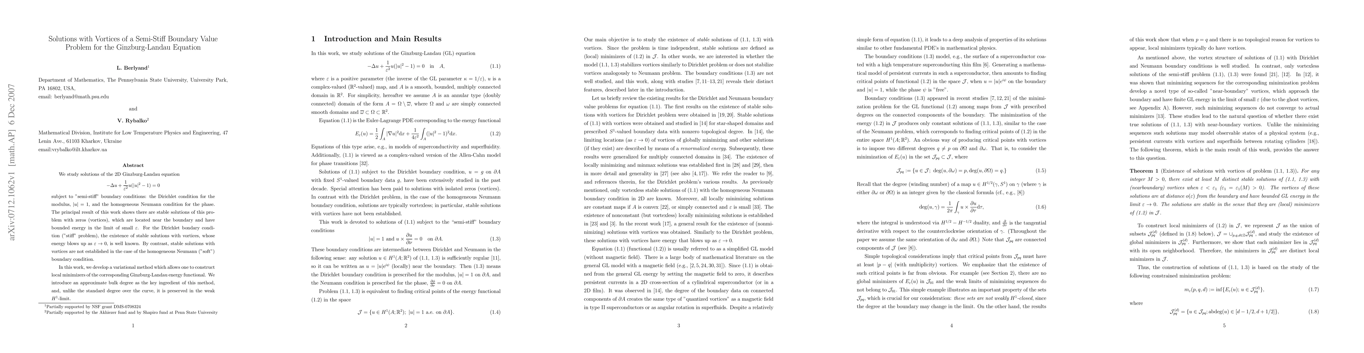 We study solutions of the 2D Ginzburg-Landau equation -\Delta u+\frac{1}{\ve^2}u(|u|^2-1)=0 subject to "semi-stiff" boundary conditions: the Dirichlet condition for the modulus, |u|=1, and the homogeneous Neumann condition for the phase. The principal result of this work shows there are stable solutions of this problem with zeros (vortices), which are located near the boundary and have bounded energy in the limit of small epsilon. For the Dirichlet bondary condition ("stiff" problem), the existence of stable solutions with vortices, whose energy blows up as epsilon goes to 0, is well known. By contrast, stable solutions with vortices are not established in the case of the homogeneous Neumann ("soft") boundary condition. (nonexistence is proved for simply connected domains). In this work, we develop a variational method which allows one to construct local minimizers of the corresponding Ginzburg-Landau energy functional. We introduce an approximate bulk degree as the key ingredient of this method, and, unlike the standard degree over the curve, it is preserved in the weak H^1-limit.