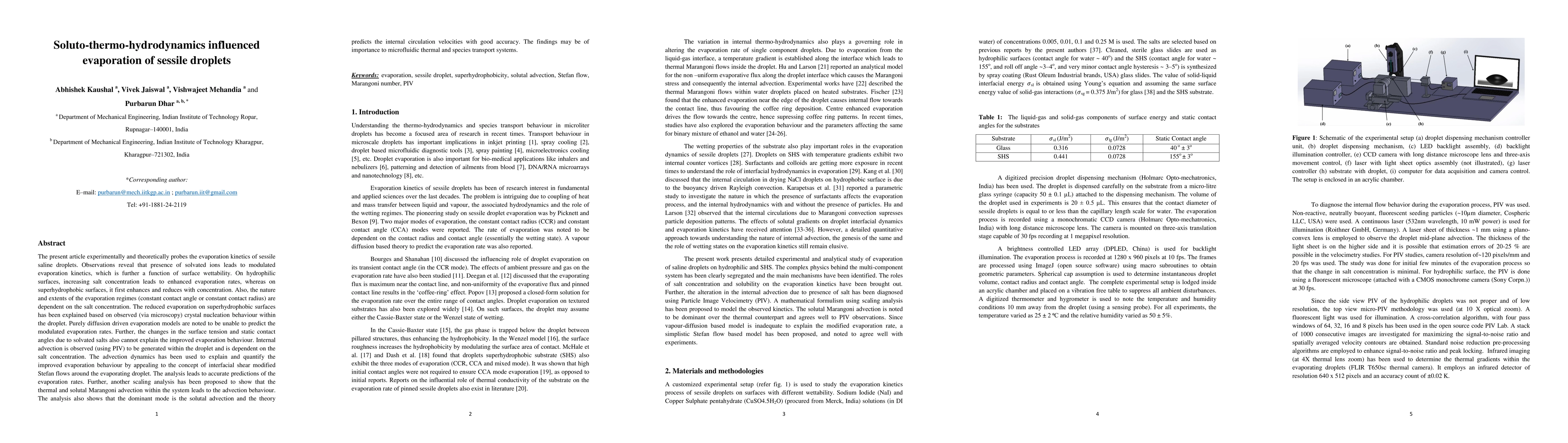 The present article experimentally and theoretically probes the evaporation kinetics of sessile saline droplets. Observations reveal that presence of solvated ions leads to modulated evaporation kinetics, which is further a function of surface wettability. On hydrophilic surfaces, increasing salt concentration leads to enhanced evaporation rates, whereas on superhydrophobic surfaces, it first enhances and reduces with concentration. Also, the nature and extents of the evaporation regimes constant contact angle or constant contact radius are dependent on the salt concentration. The reduced evaporation on superhydrophobic surfaces has been explained based on observed via microscopy crystal nucleation behaviour within the droplet. Purely diffusion driven evaporation models are noted to be unable to predict the modulated evaporation rates. Further, the changes in the surface tension and static contact angles due to solvated salts also cannot explain the improved evaporation behaviour. Internal advection is observed using PIV to be generated within the droplet and is dependent on the salt concentration. The advection dynamics has been used to explain and quantify the improved evaporation behaviour by appealing to the concept of interfacial shear modified Stefan flows around the evaporating droplet. The analysis leads to accurate predictions of the evaporation rates. Further, another scaling analysis has been proposed to show that the thermal and solutal Marangoni advection within the system leads to the advection behaviour. The analysis also shows that the dominant mode is the solutal advection and the theory predicts the internal circulation velocities with good accuracy. The findings may be of importance to microfluidic thermal and species transport systems.