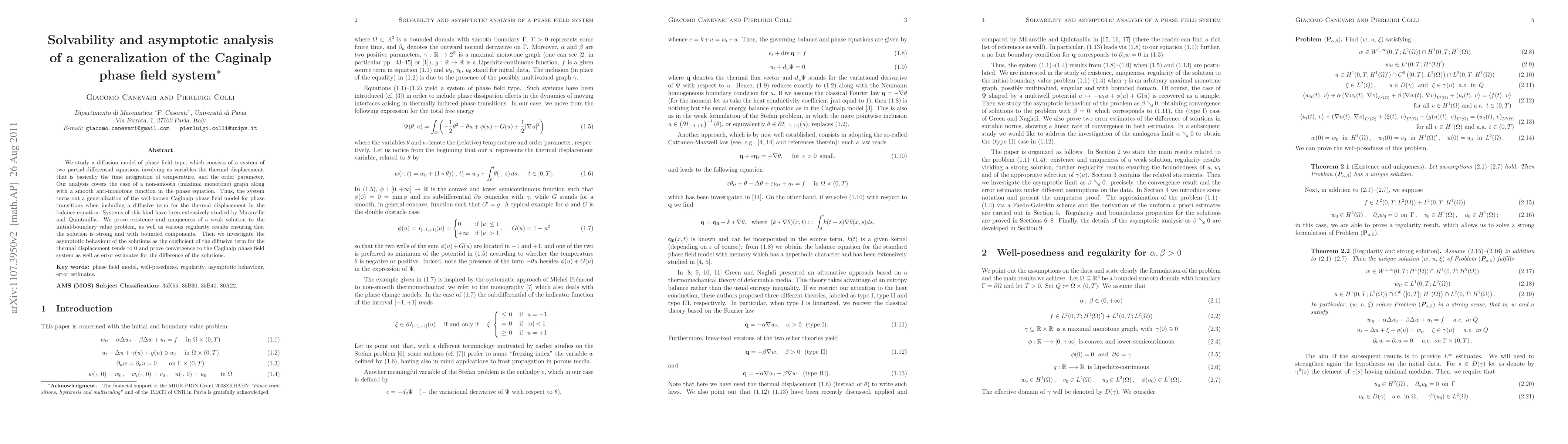 This paper studies a generalized phase field system with a diffusive term for thermal displacement, proving existence, uniqueness, and regularity of weak solutions. It also investigates the asymptotic behavior, showing convergence to the Caginalp phase field system as the diffusive coefficient approaches zero.
