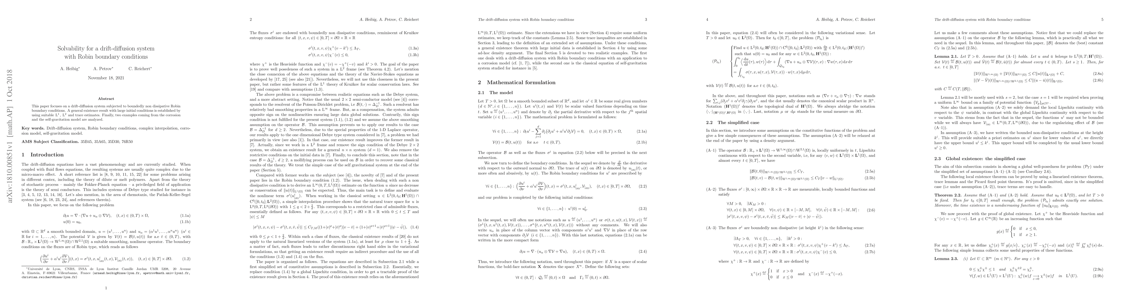 This paper establishes existence results for a drift-diffusion system with Robin boundary conditions, showing solvability under large initial conditions. Examples from corrosion and self-gravitation models demonstrate the applicability of these findings.