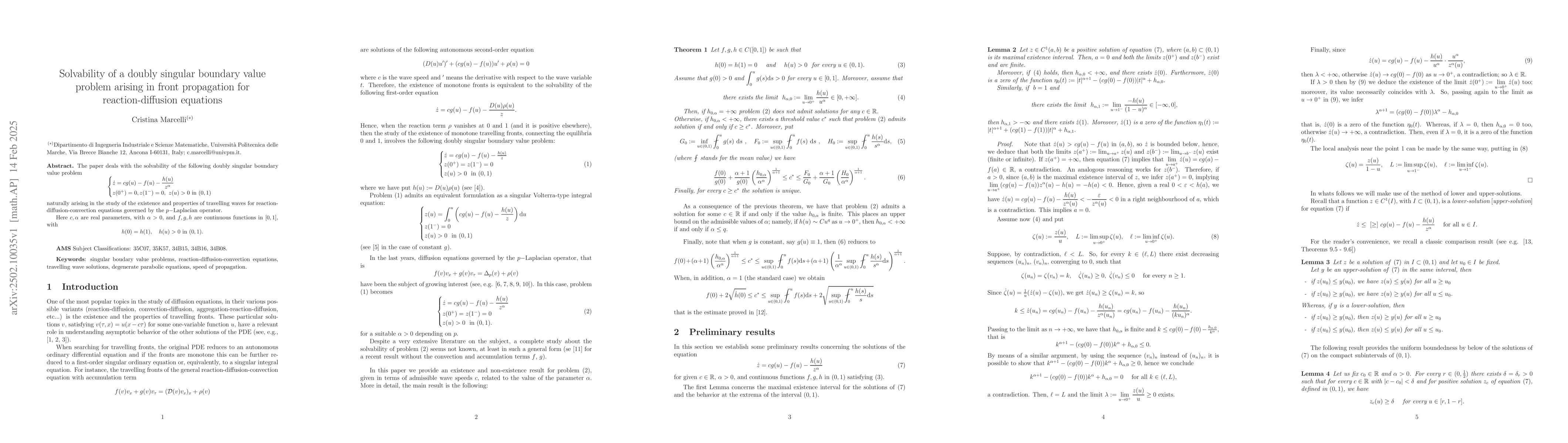 This paper investigates the solvability of a doubly singular boundary value problem for reaction-diffusion equations, focusing on the existence of travelling waves described by the given problem. The study employs the $p-$Laplacian operator and addresses the conditions under which solutions exist.