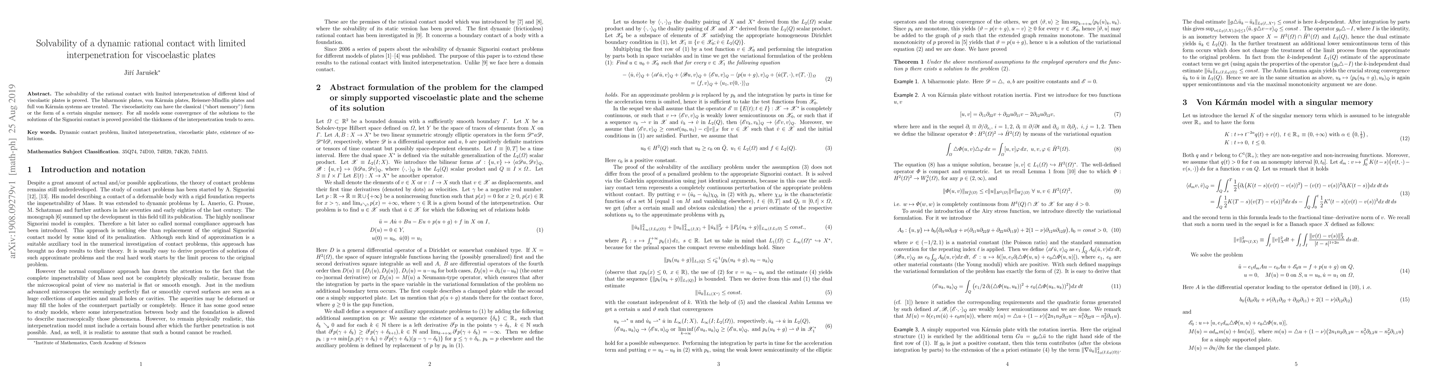 The solvability of the rational contact with limited interpenetration of different kind of viscolastic plates is proved. The biharmonic plates, von K\'arm\'an plates, Reissner-Mindlin plates and full von K\'arm\'an systems are treated. The viscoelasticity can have the classical (``short memory'') form or the form of a certain singular memory. For all models some convergence of the solutions to the solutions of the Signorini contact is proved provided the thickness of the interpenetration tends to zero.