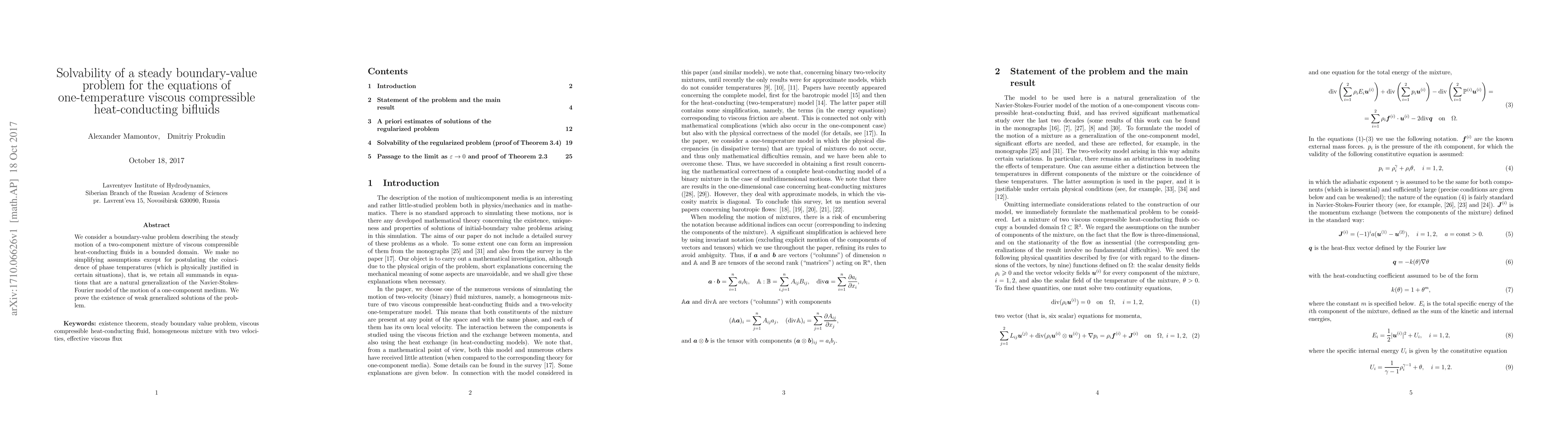This paper investigates the steady boundary-value problem for the equations governing the motion of two viscous, compressible, heat-conducting fluids in a bounded domain, assuming equal phase temperatures. The authors prove the existence of weak generalized solutions without simplifying assumptions, extending the Navier-Stokes-Fourier model.