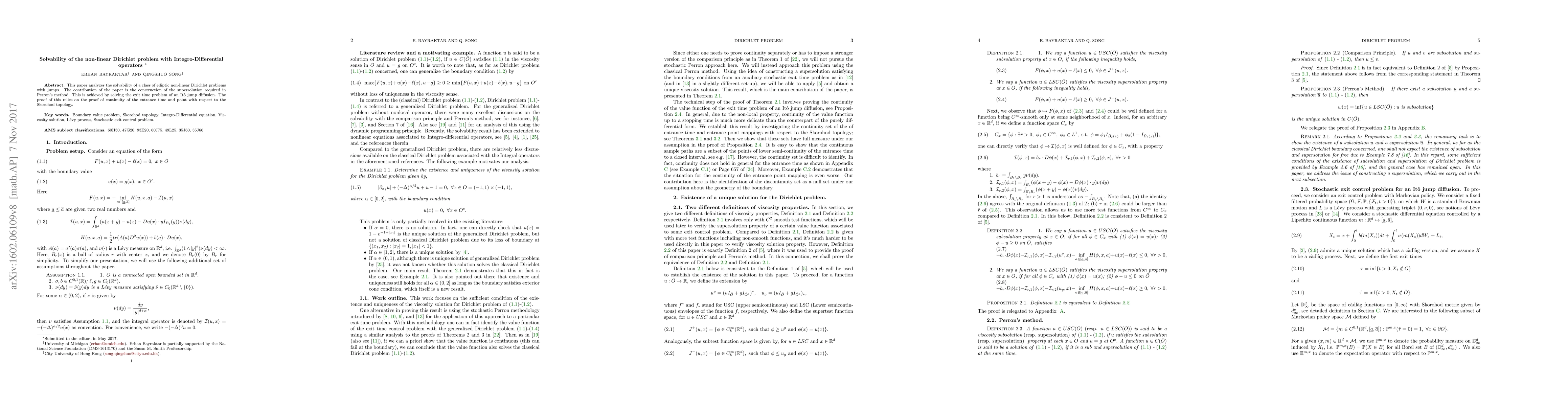 This paper investigates the solvability of Dirichlet problems linked to non-linear integro-differential operators, utilizing a probabilistic approach to construct continuous supersolutions through the identification of exit time operators' continuity sets under Skorohod topology.