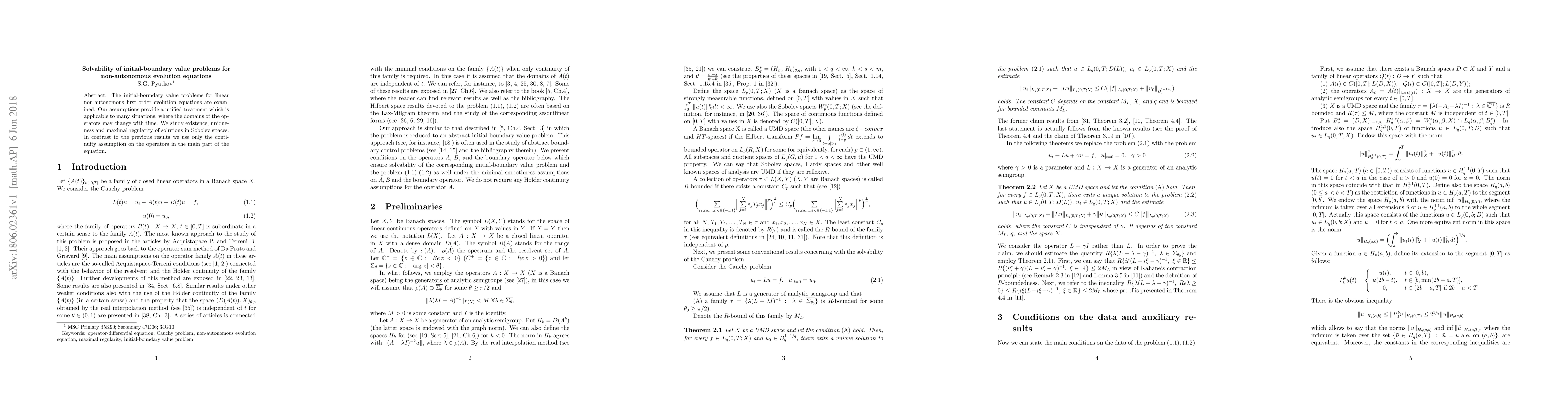 This paper examines the solvability of initial-boundary value problems for linear non-autonomous first-order evolution equations, focusing on existence, uniqueness, and maximal regularity of solutions in Sobolev spaces. It employs a unified treatment that only requires continuity of operators for the main part of the equation.