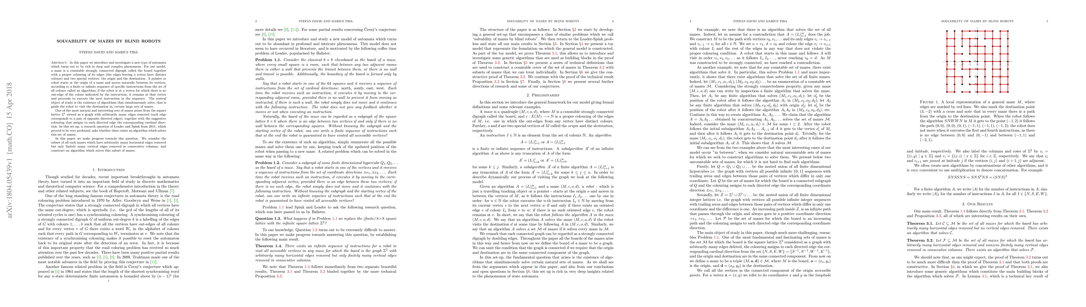 In this paper we introduce and investigate a new type of automata which turns out to be rich in deep and complex phenomena. For our model, a maze is a countable strongly connected digraph called the board together with a proper colouring of its edges (the edges leaving a vertex have distinct colours) and two special vertices: the origin and the destination. A pointer or robot starts at the origin of a maze and moves naturally between its vertices, according to a finite or infinite sequence of specific instructions from the set of all colours called an algorithm; if the robot is at a vertex for which there is no out-edge of the colour indicated by the instruction, it remains at that vertex and proceeds to execute the next instruction in the sequence. The central object of study is the existence of algorithms that simultaneously solve, that is guide the robot to visit the destination in, certain large sets of mazes. One of the most natural and interesting sets of mazes arises from the square lattice $\Z^2$ viewed as a graph with arbitrarily many edges removed (each edge corresponds to a pair of opposite directed edges), together with the suggestive colouring that assigns to each directed edge the corresponding cardinal direction. In this set-up, a research question of Leader and Spink from 2011, which proved to be very profound, asks whether there exists an algorithm which solves this set of mazes. In this paper we make progress towards this question. We consider the subset of all such mazes which have arbitrarily many horizontal edges removed but only finitely many vertical edges removed in consecutive columns, and construct an algorithm which solves this subset of mazes.