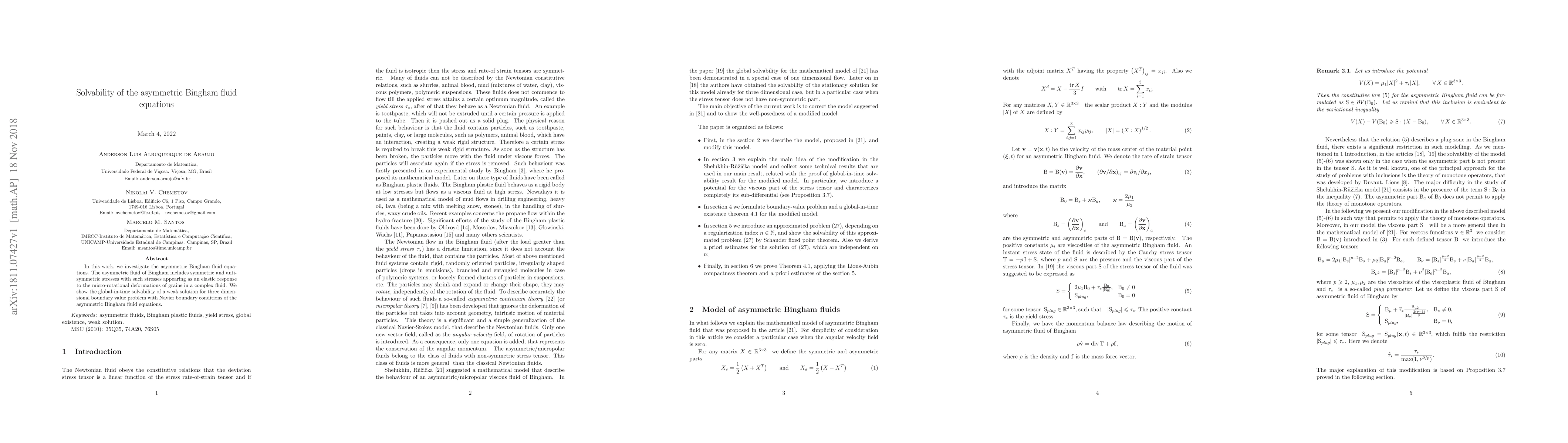 In this work, we investigate the asymmetric Bingham fluid equations. The asymmetric fluid of Bingham includes symmetric and antisymmetric stresses with such stresses appearing as an elastic response to the micro-rotational deformations of grains in a complex fluid. We show the global-in-time solvability of a weak solution for three dimensional boundary value problem with Navier boundary conditions of the asymmetric Bingham fluid equations.