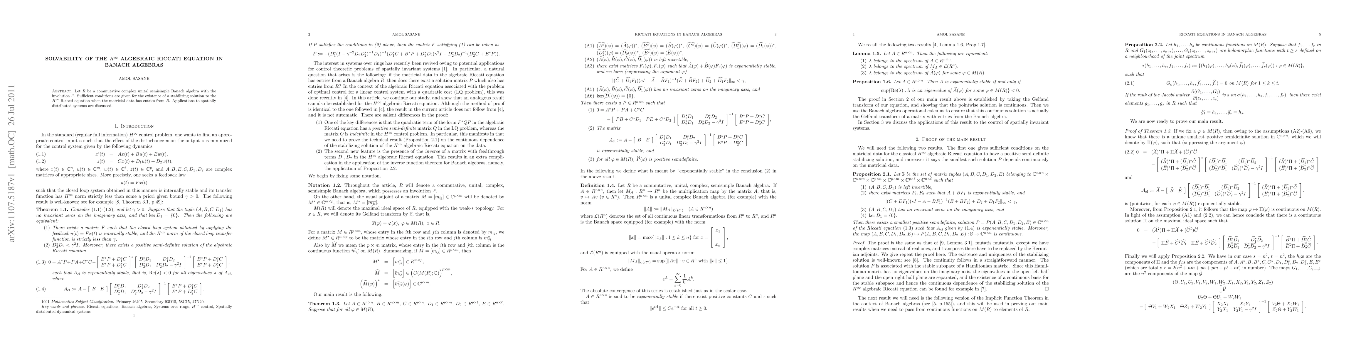Let $R$ be a commutative complex unital semisimple Banach algebra with the involution $\cdot ^\star$. Sufficient conditions are given for the existence of a stabilizing solution to the $H^\infty$ Riccati equation when the matricial data has entries from $R$. Applications to spatially distributed systems are discussed.
