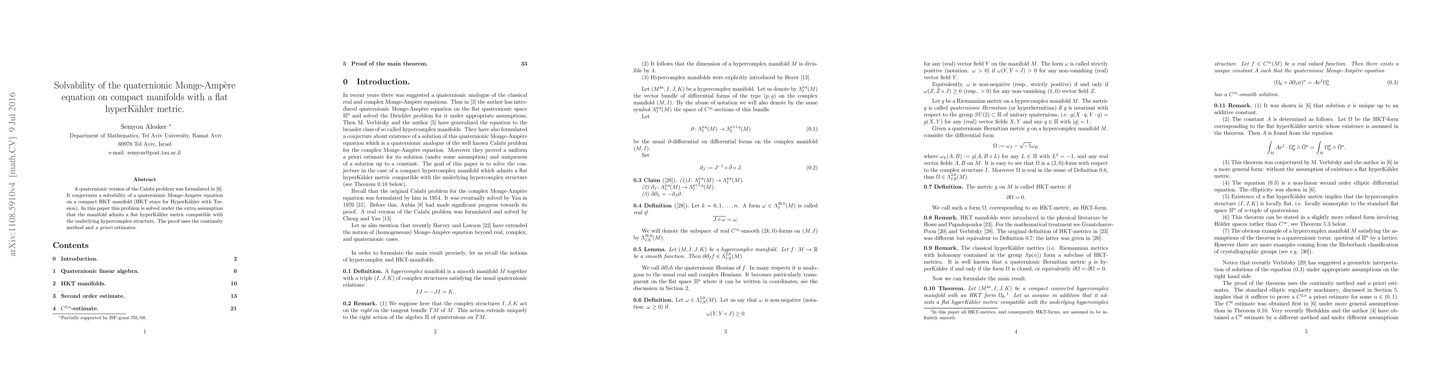 This paper solves the quaternionic Monge-Ampere equation on compact hyperKaehler manifolds with torsion (HKT) under the assumption of a compatible flat hyperKaehler metric, employing the continuity method and a priori estimates. The result addresses a conjecture by M. Verbitsky and the author regarding the solvability of a quaternionic version of the Calabi problem.