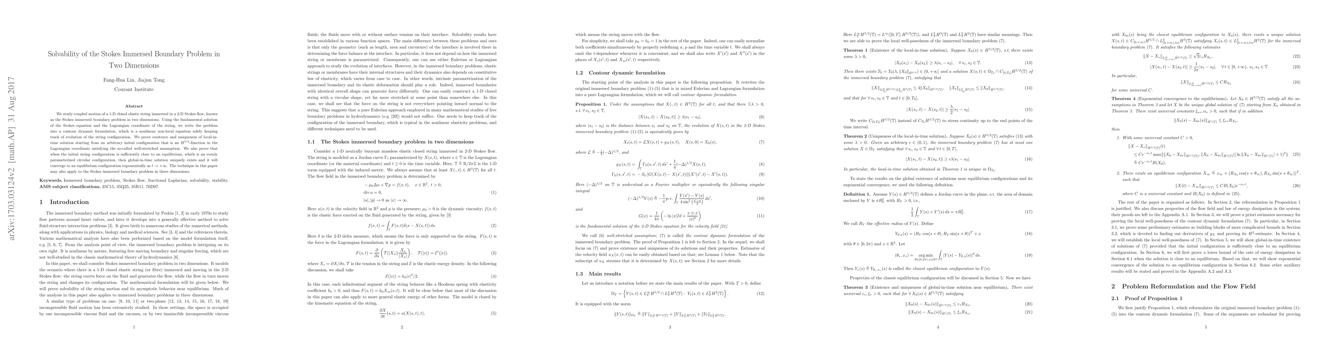 This paper investigates the solvability of the Stokes immersed boundary problem for a 1-D elastic string in 2-D Stokes flow, proving local and global existence of solutions under specific initial conditions. The method uses a contour dynamic formulation to track the string's evolution and may extend to three dimensions.
