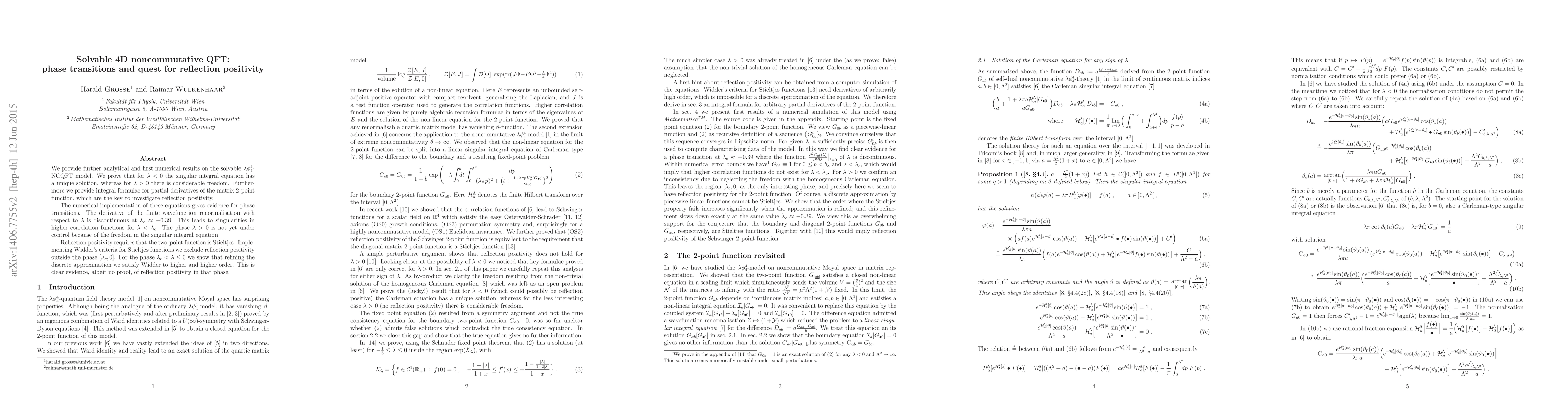 We provide further analytical and first numerical results on the solvable $\lambda\phi^4_4$-NCQFT model. We prove that for $\lambda<0$ the singular integral equation has a unique solution, whereas for $\lambda>0$ there is considerable freedom. Furthermore we provide integral formulae for partial derivatives of the matrix 2-point function, which are the key to investigate reflection positivity. The numerical implementation of these equations gives evidence for phase transitions. The derivative of the finite wavefunction renormalisation with respect to $\lambda$ is discontinuous at $\lambda_c \approx -0.39$. This leads to singularities in higher correlation functions for $\lambda<\lambda_c$. The phase $\lambda >0$ is not yet under control because of the freedom in the singular integral equation. Reflection positivity requires that the two-point function is Stieltjes. Implementing Widder's criteria for Stieltjes functions we exclude reflection positivity outside the phase $[\lambda_c,0]$. For the phase $\lambda_c<\lambda \leq 0$ we show that refining the discrete approximation we satisfy Widder to higher and higher order. This is clear evidence, albeit no proof, of reflection positivity in that phase.