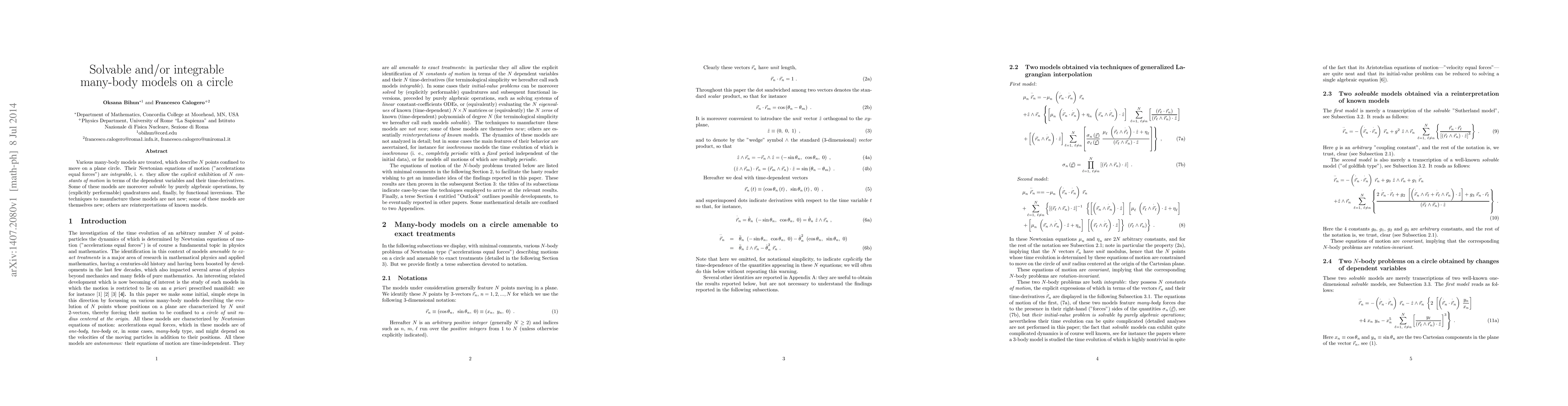 Various many-body models are treated, which describe $N$ points confined to move on a plane circle. Their Newtonian equations of motion ("accelerations equal forces") are integrable, i. e. they allow the explicit exhibition of $N$ constants of motion in terms of the dependent variables and their time-derivatives. Some of these models are moreover solvable by purely algebraic operations, by (explicitly performable) quadratures and, finally, by functional inversions. The techniques to manufacture these models are not new; some of these models are themselves new; others are reinterpretations of known models.