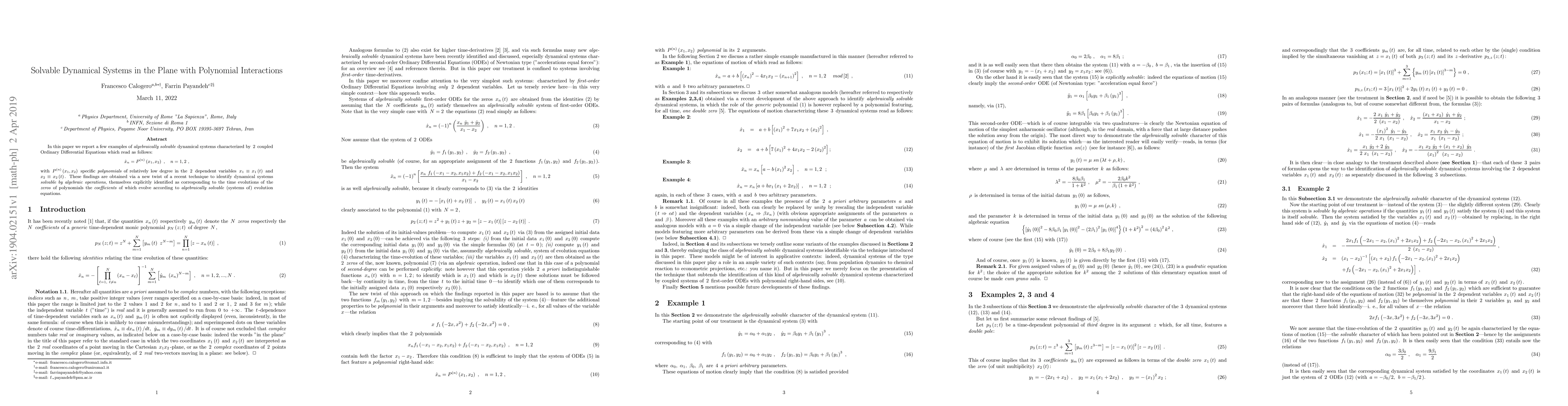 In this paper we report a few examples of algebraically solvable dynamical systems characterized by 2 coupled Ordinary Differential Equations which read as follows: x_n = P(n) (x1, x2) , n = 1, 2 , with P(n) (x1, x2) specific polynomials of relatively low degree in the 2 dependent variables x1 = x1 (t) and x2 = x2 (t) . These findings are obtained via a new twist of a recent technique to identify dynamical systems solvable by algebraic operations, themselves explicitly identified as corresponding to the time evolutions of the zeros of polynomials the coefficients of which evolve according to algebraically solvable (systems of) evolution equations.