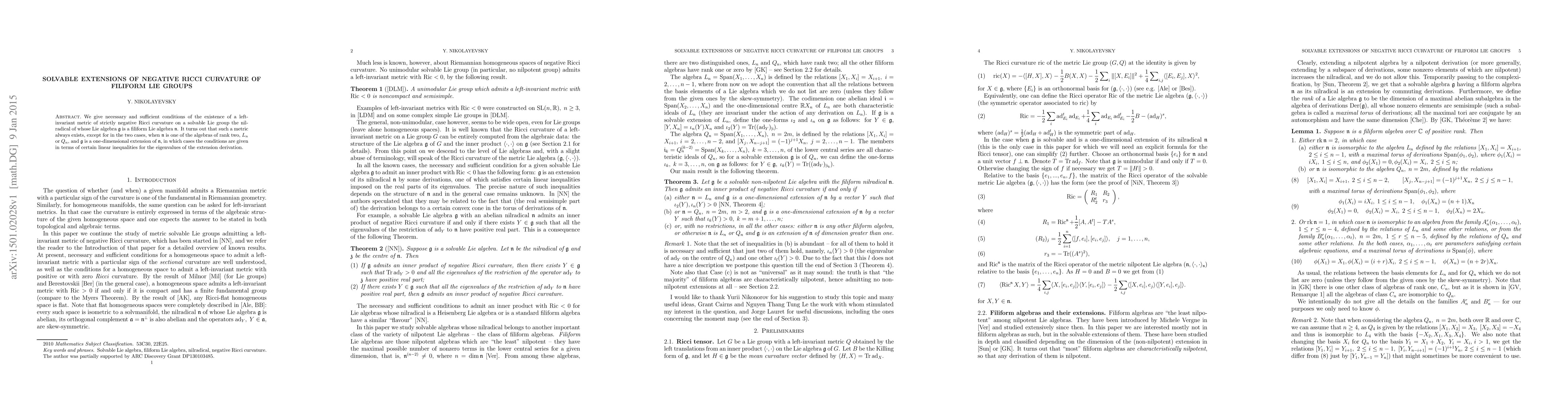 We give necessary and sufficient conditions of the existence of a left-invariant metric of strictly negative Ricci curvature on a solvable Lie group the nilradical of whose Lie algebra $\mathfrak{g}$ is a filiform Lie algebra $\mathfrak{n}$. It turns out that such a metric always exists, except for in the two cases, when $\mathfrak{n}$ is one of the algebras of rank two, $L_n$ or $Q_n$, and $\mathfrak{g}$ is a one-dimensional extension of $\mathfrak{n}$, in which cases the conditions are given in terms of certain linear inequalities for the eigenvalues of the extension derivation.