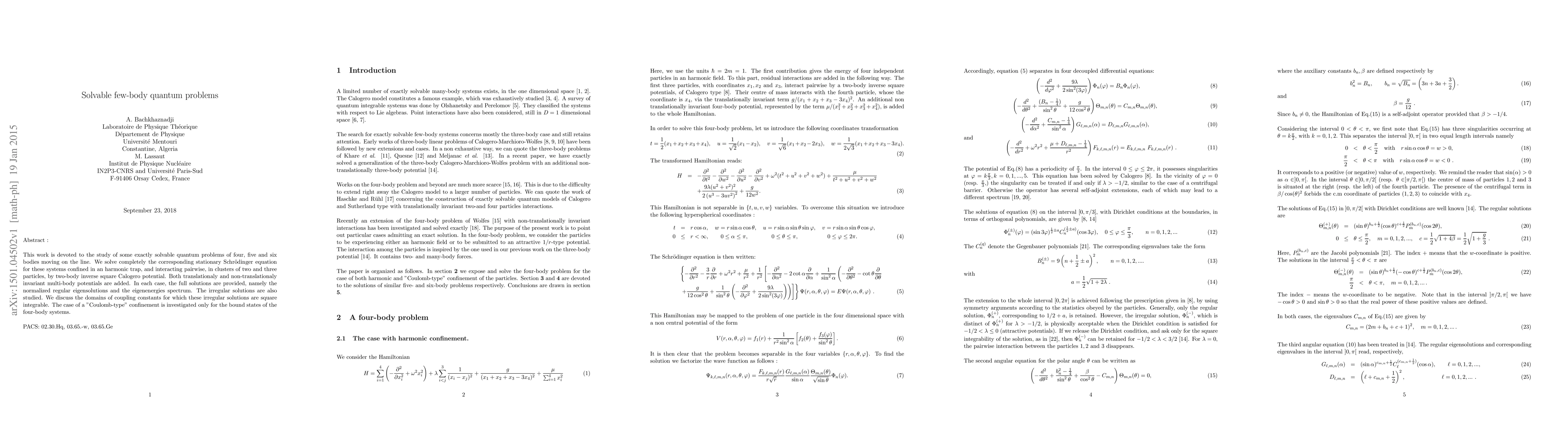 Researchers solved exactly solvable quantum problems of 4-6 body systems confined in a harmonic trap with pairwise interactions using the Calogero potential, finding solutions for regular and irregular cases.