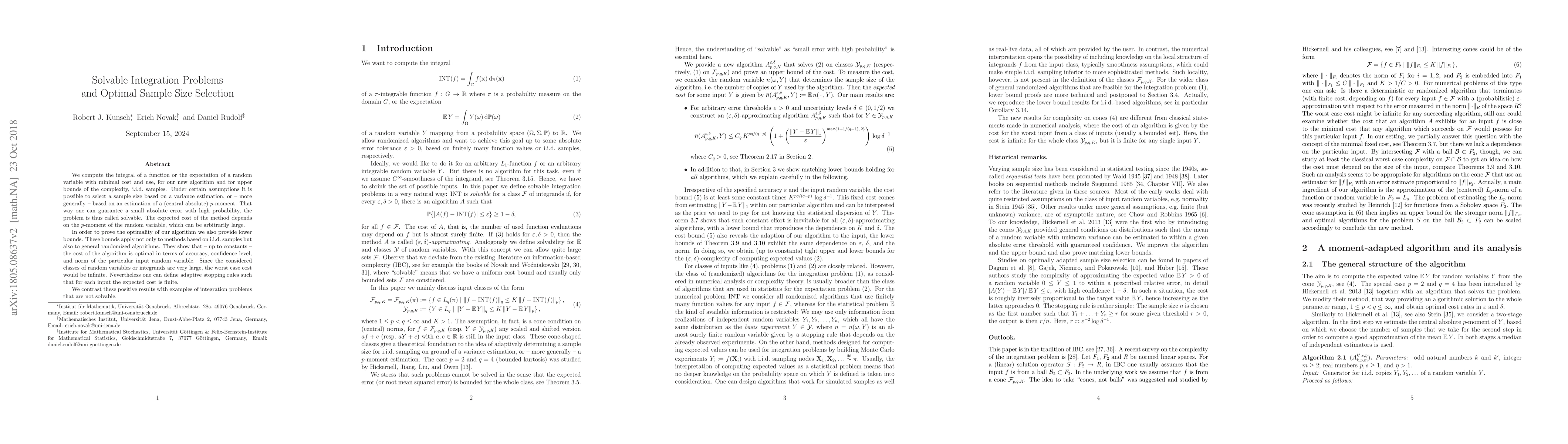 We compute the integral of a function or the expectation of a random variable with minimal cost and use, for our new algorithm and for upper bounds of the complexity, i.i.d. samples. Under certain assumptions it is possible to select a sample size based on a variance estimation, or -- more generally -- based on an estimation of a (central absolute) $p$-moment. That way one can guarantee a small absolute error with high probability, the problem is thus called solvable. The expected cost of the method depends on the $p$-moment of the random variable, which can be arbitrarily large. In order to prove the optimality of our algorithm we also provide lower bounds. These bounds apply not only to methods based on i.i.d. samples but also to general randomized algorithms. They show that -- up to constants -- the cost of the algorithm is optimal in terms of accuracy, confidence level, and norm of the particular input random variable. Since the considered classes of random variables or integrands are very large, the worst case cost would be infinite. Nevertheless one can define adaptive stopping rules such that for each input the expected cost is finite. We contrast these positive results with examples of integration problems that are not solvable.