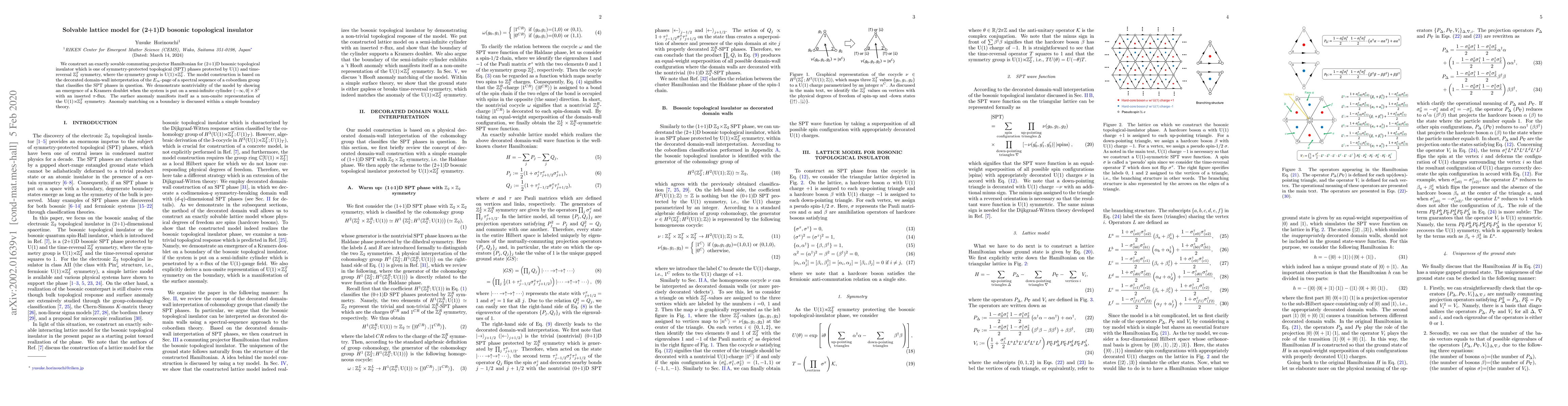 We construct an exactly sovable commuting projector Hamiltonian for (2+1)D bosonic topological insulator which is one of symmetry-protected topological (SPT) phases protected by U(1) and time-reversal $\mathbb{Z}_2^T$ symmetry, where the symmetry group is U(1)$\rtimes\mathbb{Z}_2^T$. The model construction is based on the decorated domain-wall interpretation of the $E_{\infty}$-page of a spectral sequence of a cobordism group that classifies the SPT phases in question. We demonstrate nontriviality of the model by showing an emergence of a Kramers doublet when the system is put on a semi-infinite cylinder $(-\infty,0]\times S^1$ with an inserted $\pi$-flux. The surface anomaly manifests itself as a non-onsite representation of the U(1)$\rtimes\mathbb{Z}_2^T$ symmetry. Anomaly matching on a boundary is discussed within a simple boundary theory.