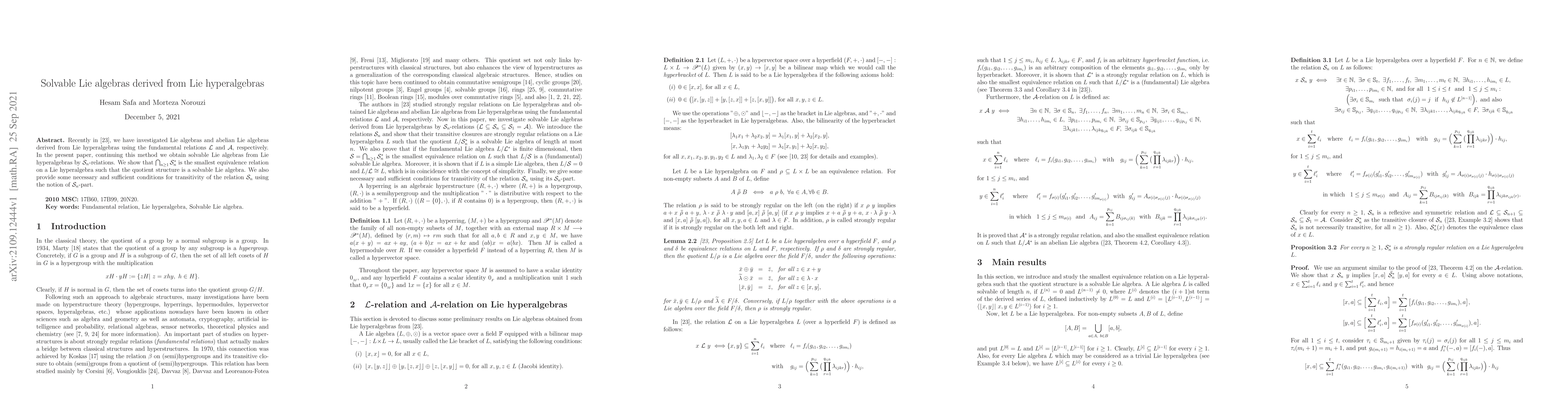 This paper investigates the derivation of solvable Lie algebras from Lie hyperalgebras via $\mathcal{S}_n$-relations. It establishes that $\bigcap_{n\geq 1}\mathcal{S}^*_n$ is the smallest equivalence relation ensuring the quotient structure is a solvable Lie algebra, and provides conditions for the transitivity of $\mathcal{S}_n$ using the $\mathcal{S}_n$-part.