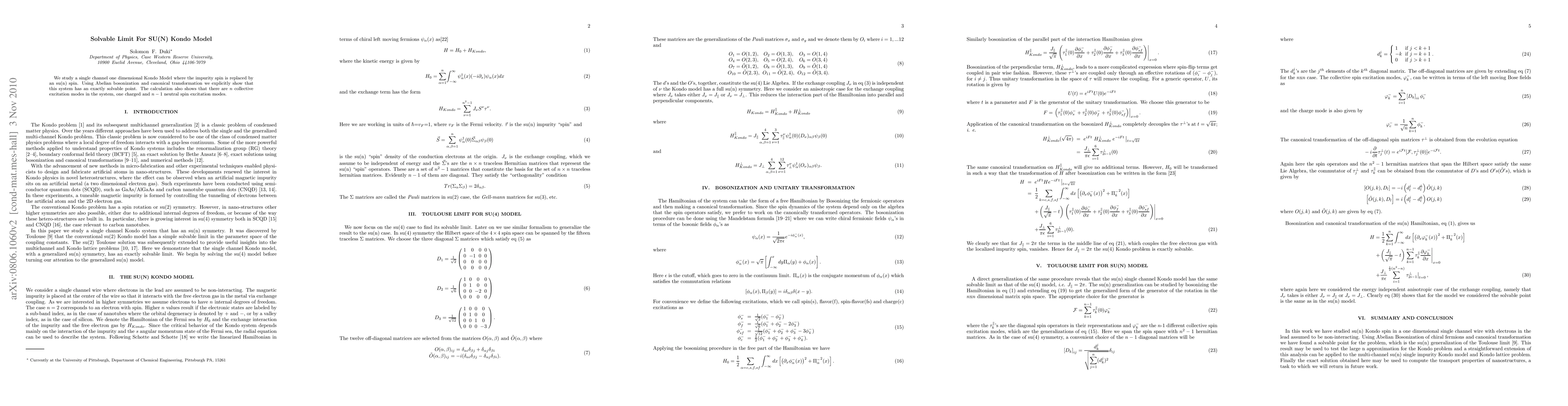 This paper demonstrates the exact solvability of a one-dimensional SU(N) Kondo model using Abelian bosonization and canonical transformation, revealing $n$ collective excitation modes, including one charged and $n-1$ neutral spin excitation modes.