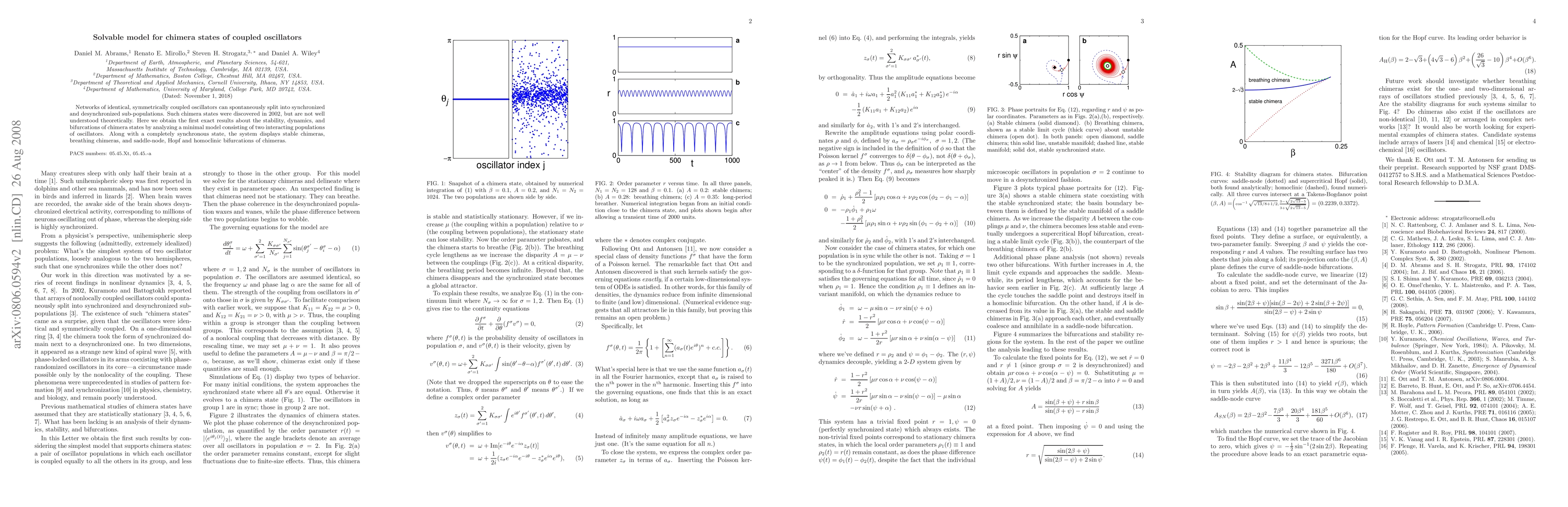 This paper presents an exact model for understanding chimera states in networks of coupled oscillators, revealing stable chimeras, breathing chimeras, and various bifurcations, including saddle-node, Hopf, and homoclinic, providing new theoretical insights into these complex phenomena.