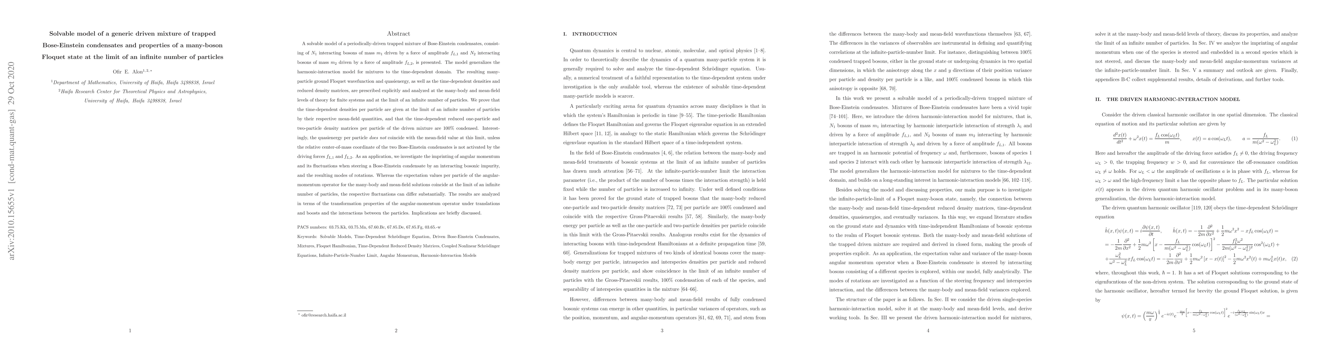 This paper presents a solvable model for a periodically-driven mixture of Bose-Einstein condensates, analyzing the properties of many-boson Floquet states at infinite particle limits. It finds that the time-dependent densities per particle align with mean-field quantities, but quasienergy per particle diverges unless the relative center-of-mass coordinate is unaffected by driving forces.