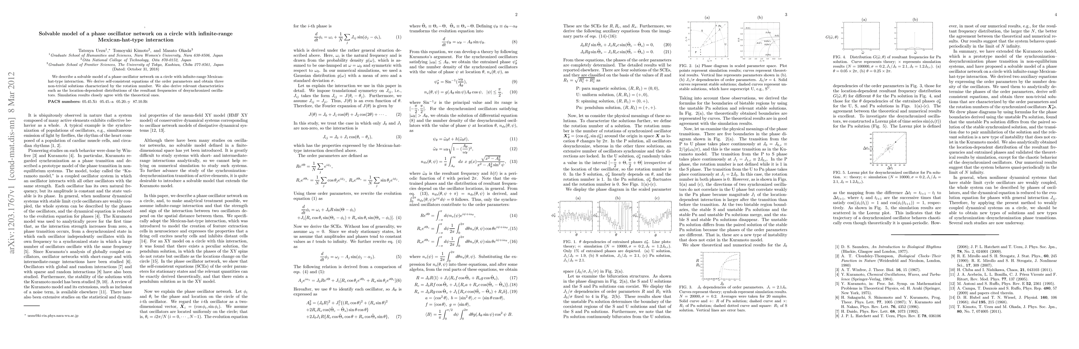 This paper presents a solvable model for a phase oscillator network on a circular topology with infinite-range Mexican-hat-type interactions. It derives self-consistent equations, identifies three non-trivial solutions characterized by rotation number, and validates the theoretical findings with simulations.