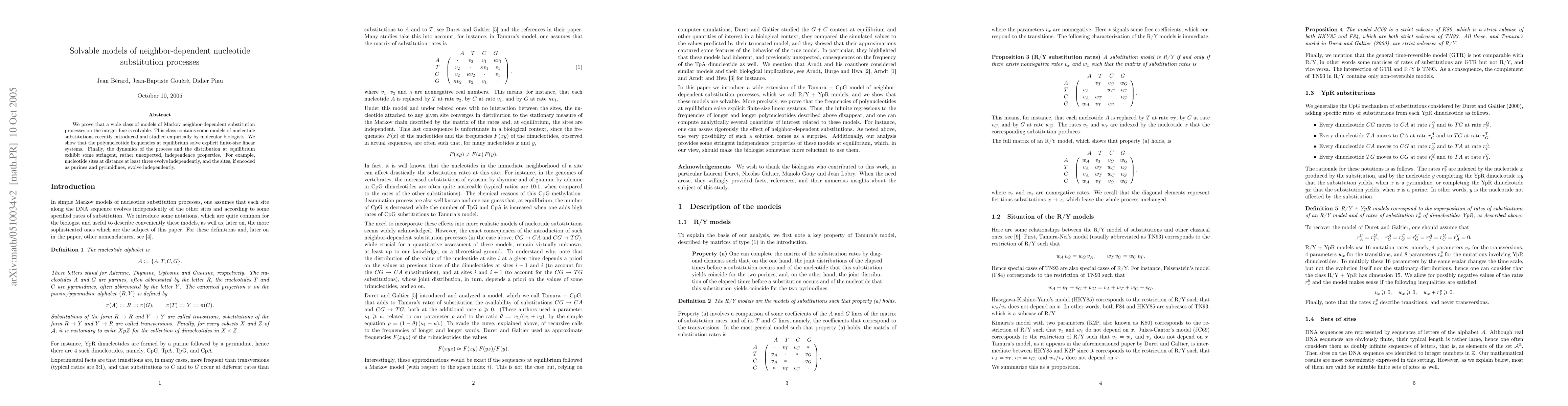 We prove that a wide class of models of Markov neighbor-dependent substitution processes on the integer line is solvable. This class contains some models of nucleotide substitutions recently introduced and studied empirically by molecular biologists. We show that the polynucleotide frequencies at equilibrium solve explicit finite-size linear systems. Finally, the dynamics of the process and the distribution at equilibrium exhibit some stringent, rather unexpected, independence properties. For example, nucleotide sites at distance at least three evolve independently, and the sites, if encoded as purines and pyrimidines, evolve independently.