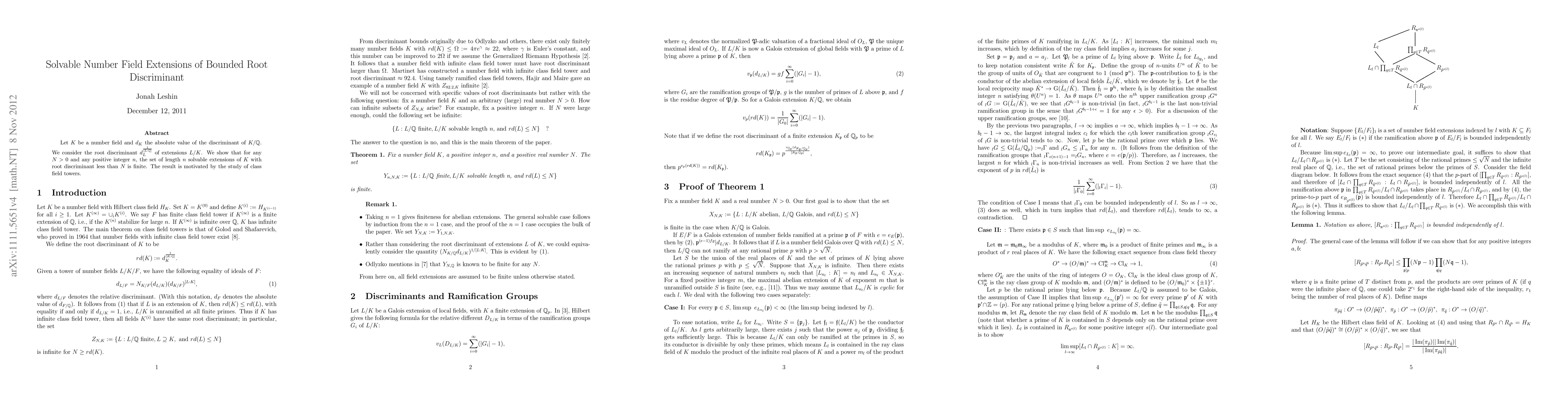 This paper investigates solvable number field extensions of a number field $K$ with bounded root discriminant, proving that the set of such extensions of a fixed length $n$ and discriminant less than $N$ is finite for any $N>0$. The result is relevant to the study of class field towers.