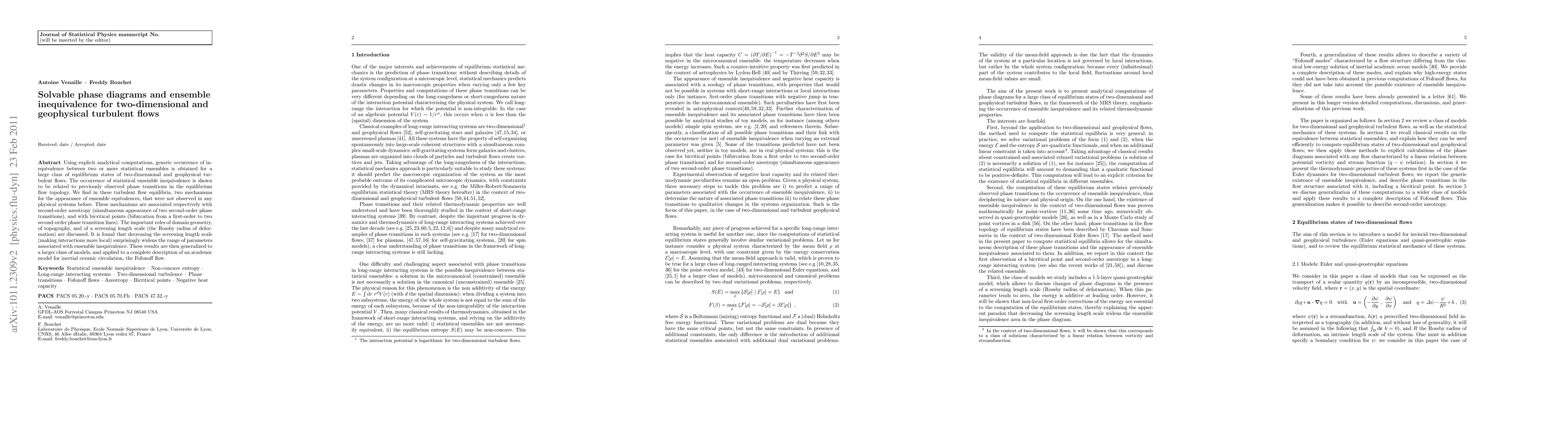 This paper reveals the generic inequivalence between statistical ensembles in two-dimensional and geophysical turbulent flows, demonstrating a link to phase transitions in flow topology. It introduces novel mechanisms for ensemble equivalence, including second-order azeotropy and bicritical points, and shows that decreasing the Rossby radius expands the range of ensemble inequivalence.
