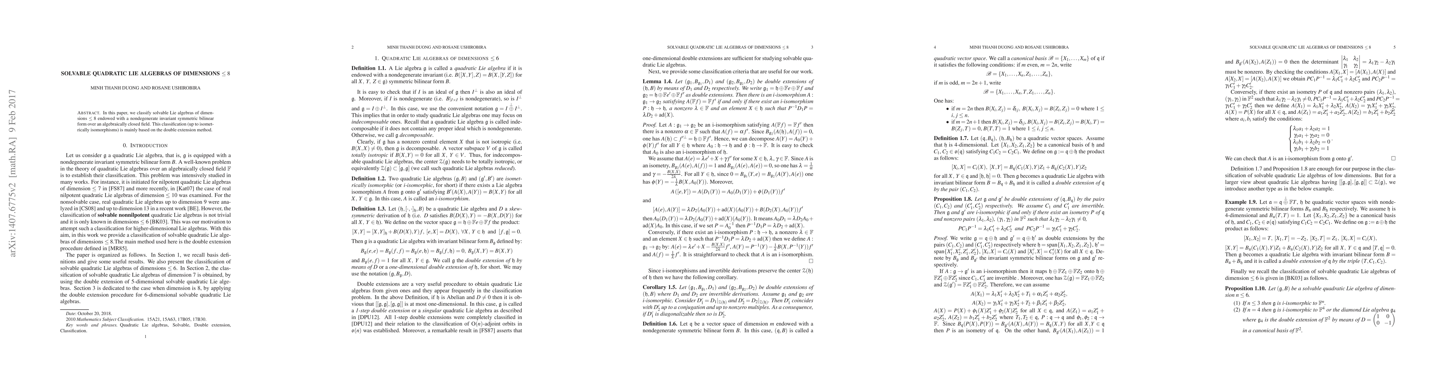In this paper, we classify solvable Lie algebras of dimensions $\leq 8$ endowed with a nondegenerate invariant symmetric bilinear form over an algebraically closed field. This classification (up to isometrically isomorphisms) is mainly based on the double extension method.