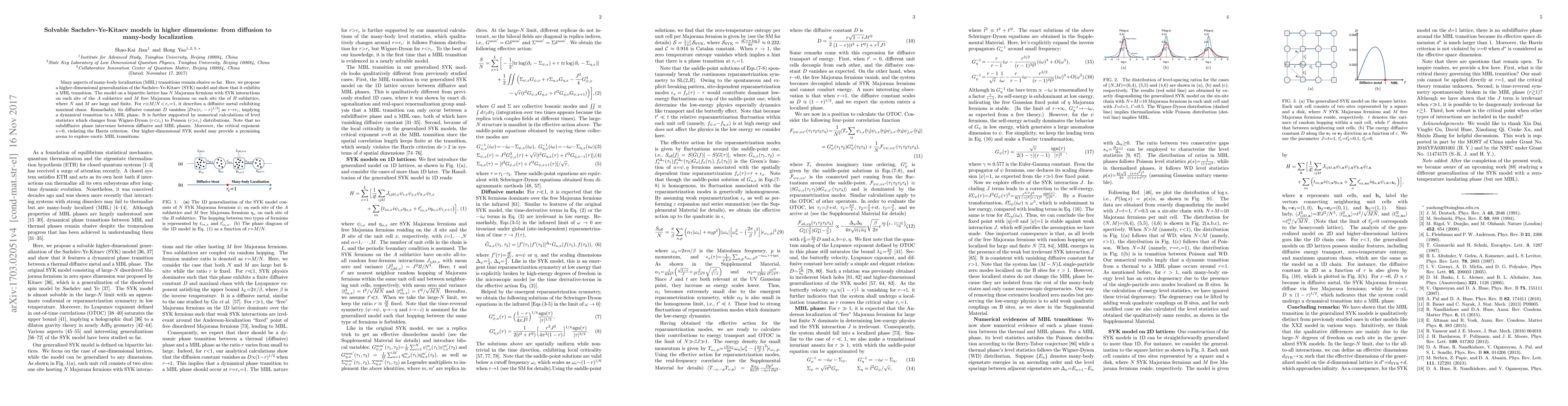 This paper proposes a higher-dimensional generalization of the Sachdev-Ye-Kitaev model, demonstrating a many-body localization transition. The model shows a diffusive metal phase transitioning to a MBL phase as a critical ratio $r$ approaches $r_c$, with no intervening subdiffusive phase and a critical exponent $\nu$=0, suggesting a unique dynamical transition mechanism.