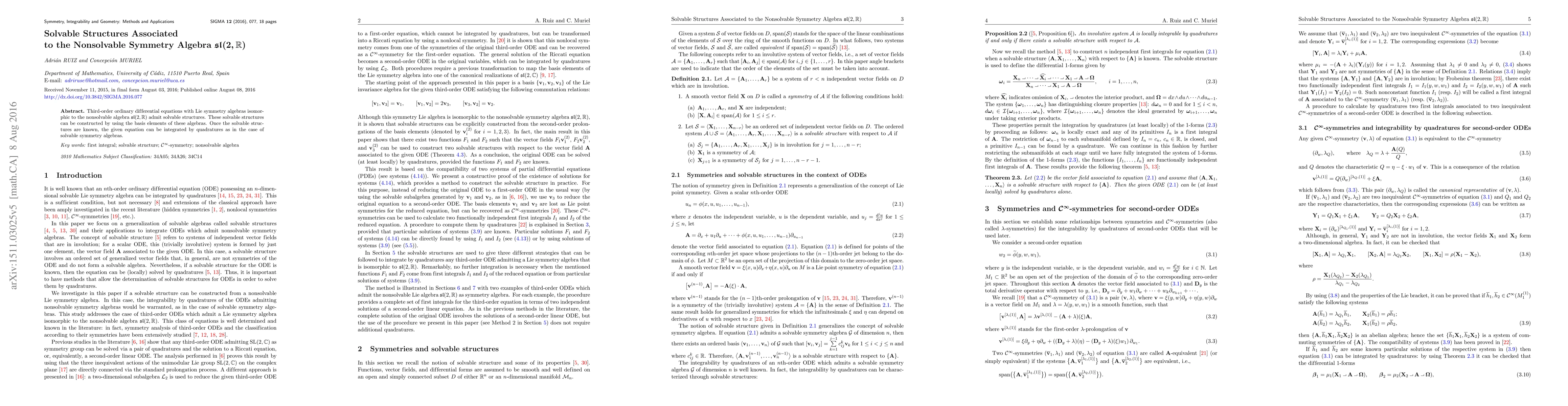This paper explores third-order ordinary differential equations with Lie symmetry algebras isomorphic to $\mathfrak{sl}(2,\mathbb{R})$, revealing that they possess solvable structures despite the nonsolvable nature of the symmetry algebra. The solvable structures are constructed using the basis elements of $\mathfrak{sl}(2,\mathbb{R})$, allowing integration of the equations by quadratures.