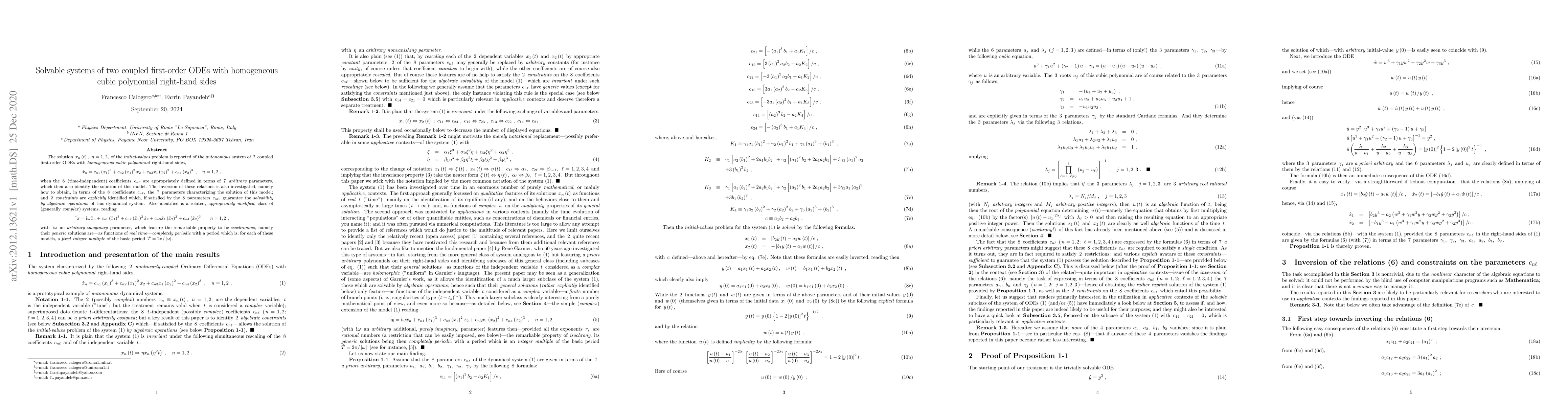 The solution $x_n\left(t\right)$, $n=1,2,$ of the \textit{initial-values} problem is reported of the \textit{autonomous} system of $2$ coupled first-order ODEs with \textit{homogeneous cubic polynomial} right-hand sides, \begin{eqnarray} \dot{x}_n = c_{n1} \left(x_1\right)^3 + c_{n2}\left( x_1\right)^2 x_2 + c_{n3} x_1 \left(x_2\right)^2+c_{n4} \left(x_2\right)^3\ ,\quad n=1,2\ , \nonumber \end{eqnarray} when the $8$ (time-independent) coefficients $c_{n\ell}$ are appropriately defined in terms of $7$ \textit{arbitrary} parameters, which then also identify the solution of this model. The inversion of these relations is also investigated, namely how to obtain, in terms of the $8$ coefficients $c_{n\ell},$ the $7$ parameters characterizing the solution of this model; and $2$ \textit{constraints} are \textit{explicitly} identified which, if satisfied by the $8$ parameters $c_{n\ell },$ guarantee the \textit{solvability by algebraic operations} of this dynamical system. Also identified is a related, \textit{appropriately modified}, class of (generally \textit{complex}) systems, reading \begin{eqnarray} \dot{{\tilde{x}}_{n}} = \mathbf{i}\omega \tilde{x}_{n} + c_{n1}\left(\tilde{x}_{1}\right) ^{3}+c_{n2}\left( \tilde{x}_{1}\right) ^2 \tilde{x}_2 + c_{n3}\tilde{x}_1 \left( \tilde{x}_2\right)^2 + c_{n4}\left(\tilde{x}_2 \right)^3\ ,\quad n=1,2\ , \nonumber \end{eqnarray} with $\mathbf{i}\omega $ an \textit{arbitrary imaginary} parameter, which feature the remarkable property to be \textit{isochronous}, namely their \textit{generic} solutions are -- as functions of \textit{real time} -- \textit{completely periodic} with a period which is, for each of these models, a \textit{fixed} \textit{integer multiple} of the basic period $\tilde{T}=2\pi /\left\vert \omega \right\vert$.