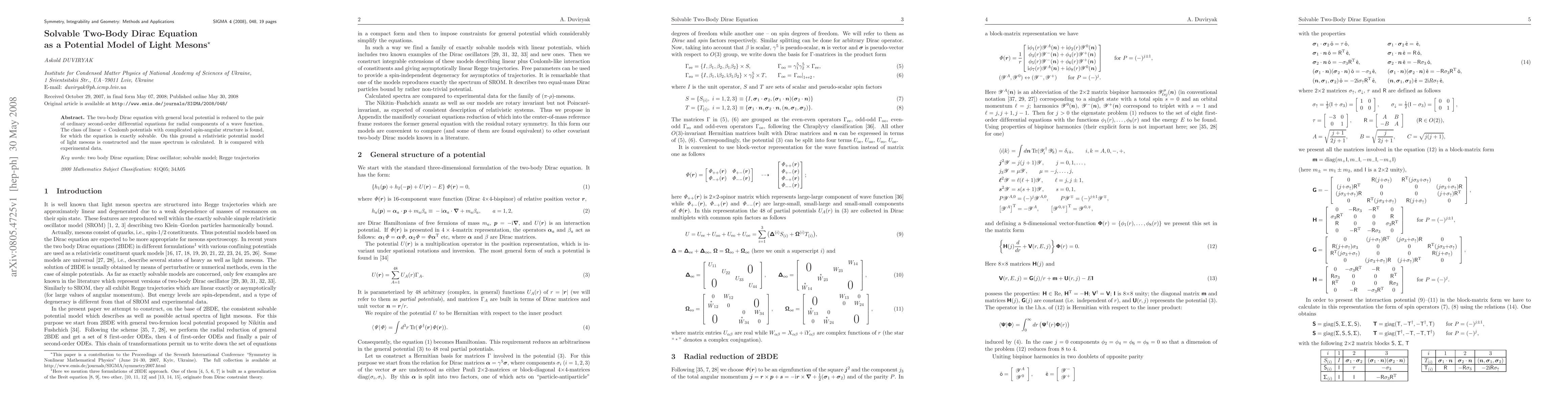 The two-body Dirac equation with general local potential is reduced to the pair of ordinary second-order differential equations for radial components of a wave function. The class of linear + Coulomb potentials with complicated spin-angular structure is found, for which the equation is exactly solvable. On this ground a relativistic potential model of light mesons is constructed and the mass spectrum is calculated. It is compared with experimental data.