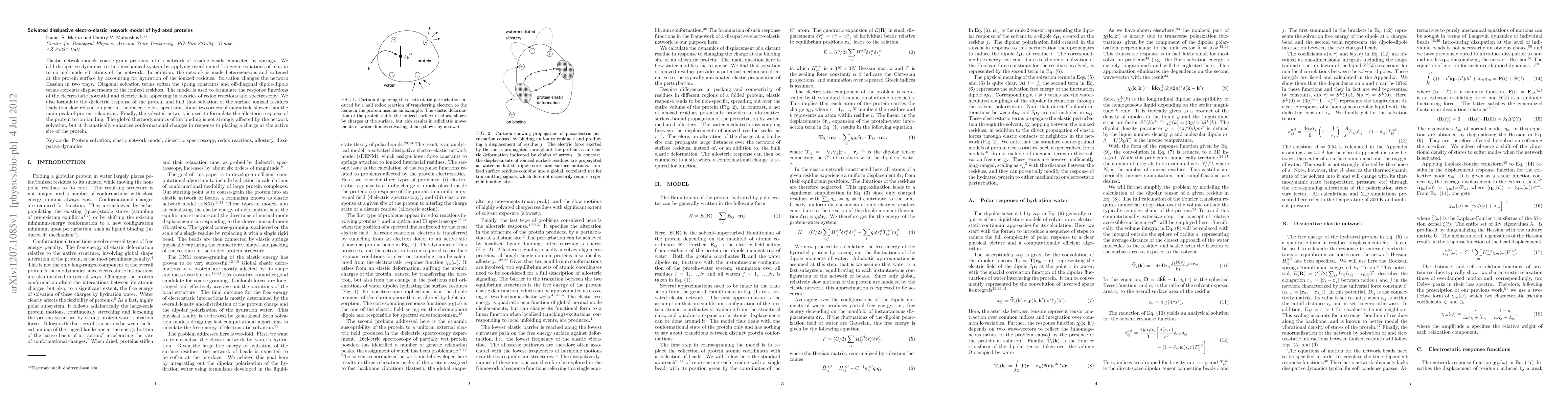 Elastic netwok models coarse grain proteins into a network of residue beads connected by springs. We add dissipative dynamics to this mechanical system by applying overdamped Langevin equations of motion to normal-mode vibrations of the network. In addition, the network is made heterogeneous and softened at the protein surface by accounting for hydration of the ionized residues. Solvation changes the network Hessian in two ways. Diagonal solvation terms soften the spring constants and off-diagonal dipole-dipole terms correlate displacements of the ionized residues. The model is used to formulate the response functions of the electrostatic potential and electric field appearing in theories of redox reactions and spectroscopy. We also formulate the dielectric response of the protein and find that solvation of the surface ionized residues leads to a slow relaxation peak in the dielectric loss spectrum, about two orders of magnitude slower than the main peak of protein relaxation. Finally, the solvated network is used to formulate the allosteric response of the protein to ion binding. The global thermodynamics of ion binding is not strongly affected by the network solvation, but it dramatically enhances conformational changes in response to placing a charge at the active site of the protein.