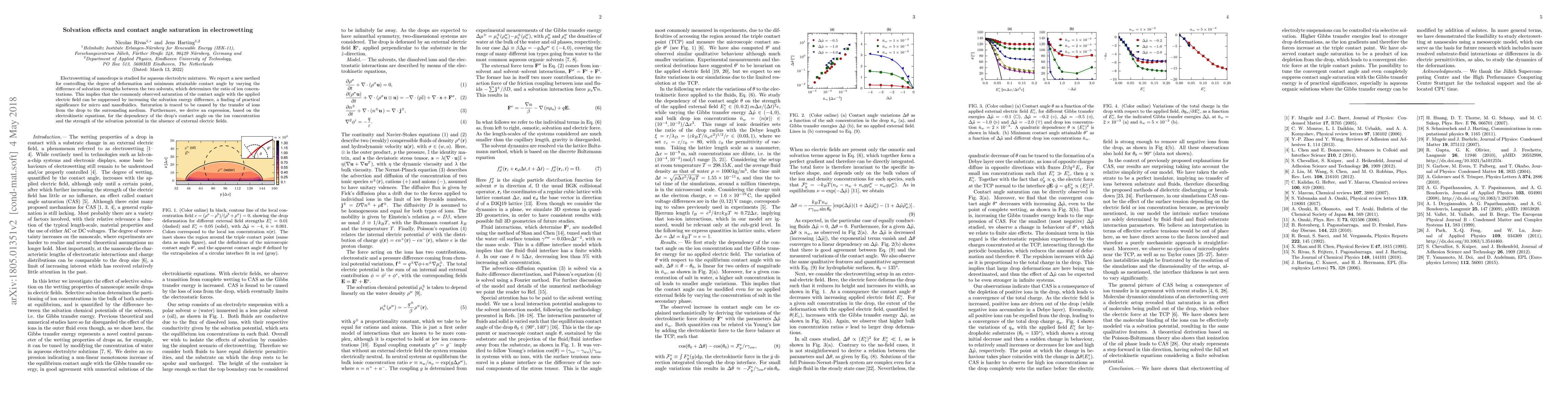 This paper proposes a method to control electrowetting in nanodrops by manipulating solvation strength differences between solvents, thus suppressing contact angle saturation by increasing solvation energy differences. It links saturation to ion transfer and provides an electrokinetic equation for contact angle dependency on ion concentration and solvation strength.