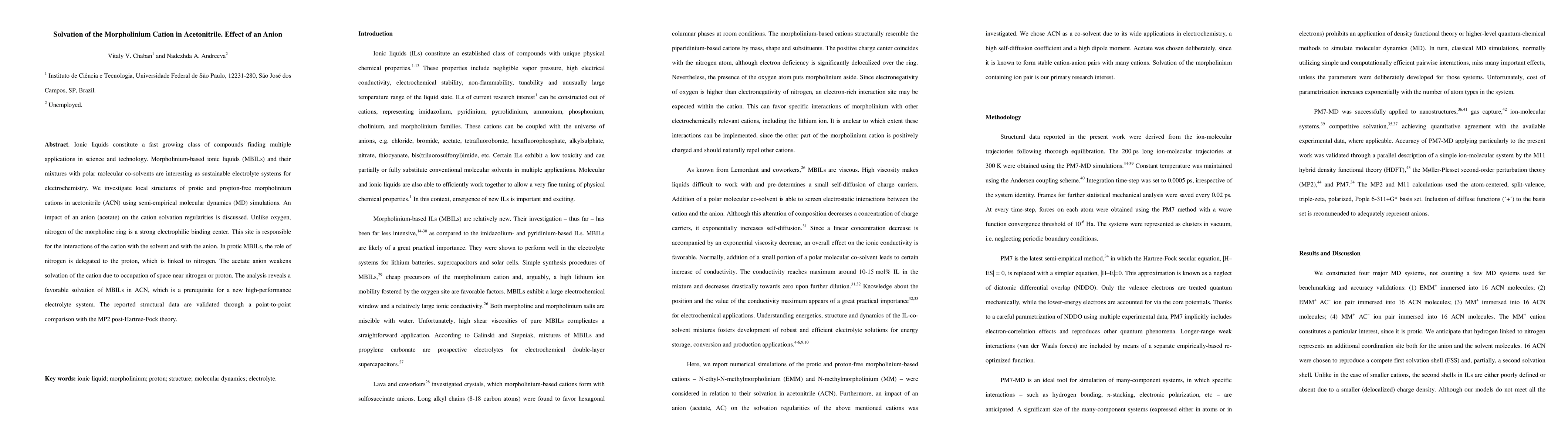 This paper investigates the solvation of morpholinium cations in acetonitrile using semi-empirical molecular dynamics simulations, focusing on the effect of the acetate anion. The study reveals that the acetate anion weakens cation solvation by occupying space near the electrophilic nitrogen site, suggesting favorable solvation conditions for potential high-performance electrolyte systems.