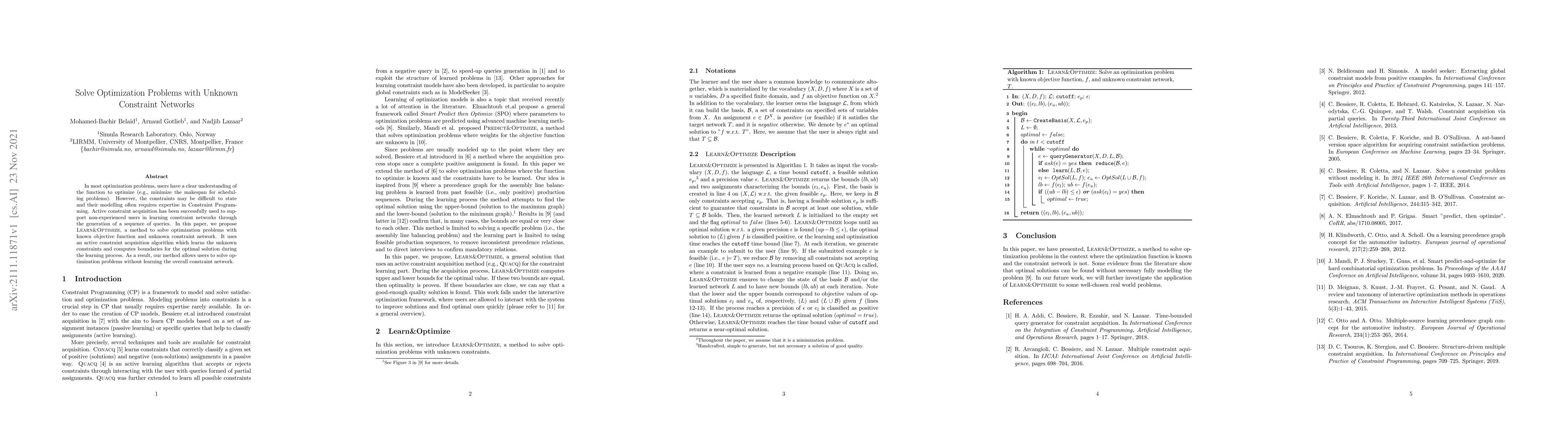 This paper proposes Learn&Optimize, a method to tackle optimization problems where the objective is known but the constraint network is unknown. It employs an active constraint acquisition algorithm to dynamically learn the constraints and compute optimal solution boundaries, enabling users to solve problems without mastering the full constraint network.