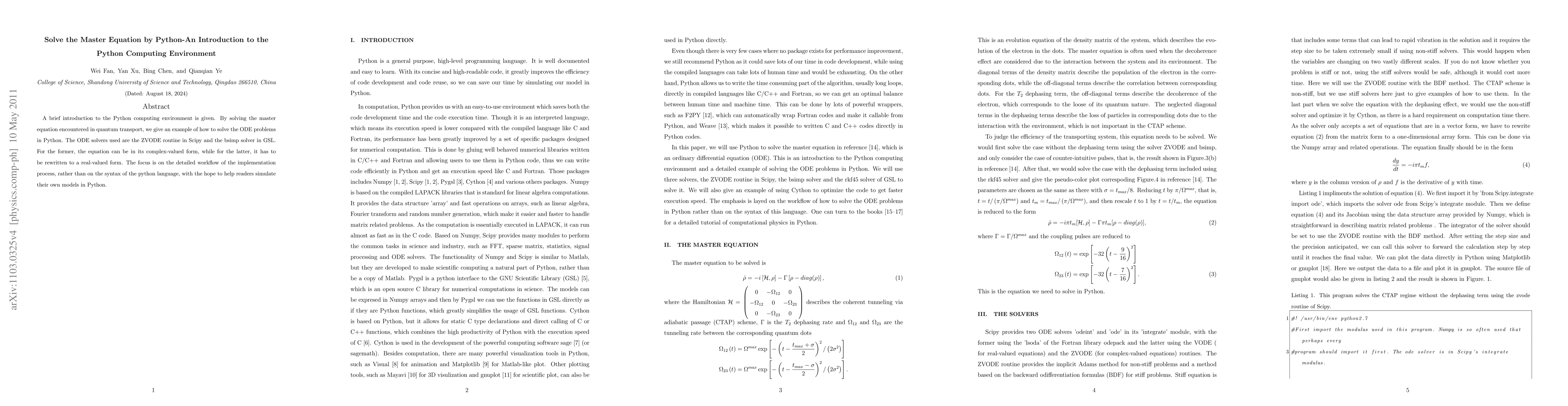 This paper introduces the Python computing environment and demonstrates solving the master equation in quantum transport using Python's Scipy and GSL libraries. It emphasizes the workflow of implementing ODE solvers, specifically ZVODE and bsimp, to help readers replicate similar simulations.