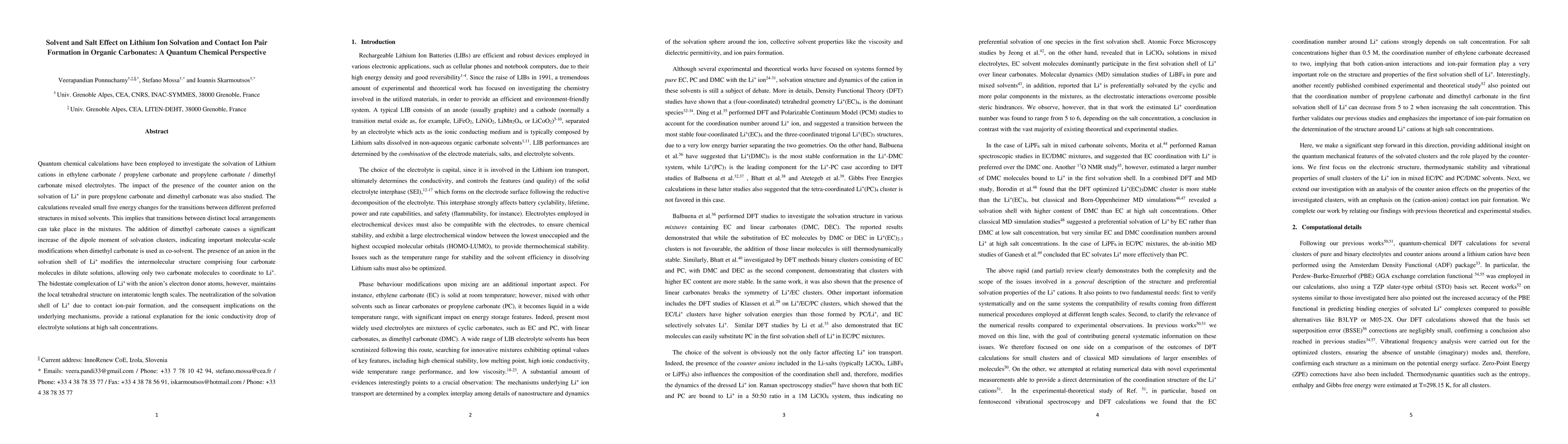 This study uses quantum chemical calculations to explore lithium ion solvation in mixed organic carbonate electrolytes, revealing small free-energy changes between preferred structures and significant dipole moment increases with dimethyl carbonate. The presence of anions modifies the solvation shell, impacting ionic conductivity at high salt concentrations.