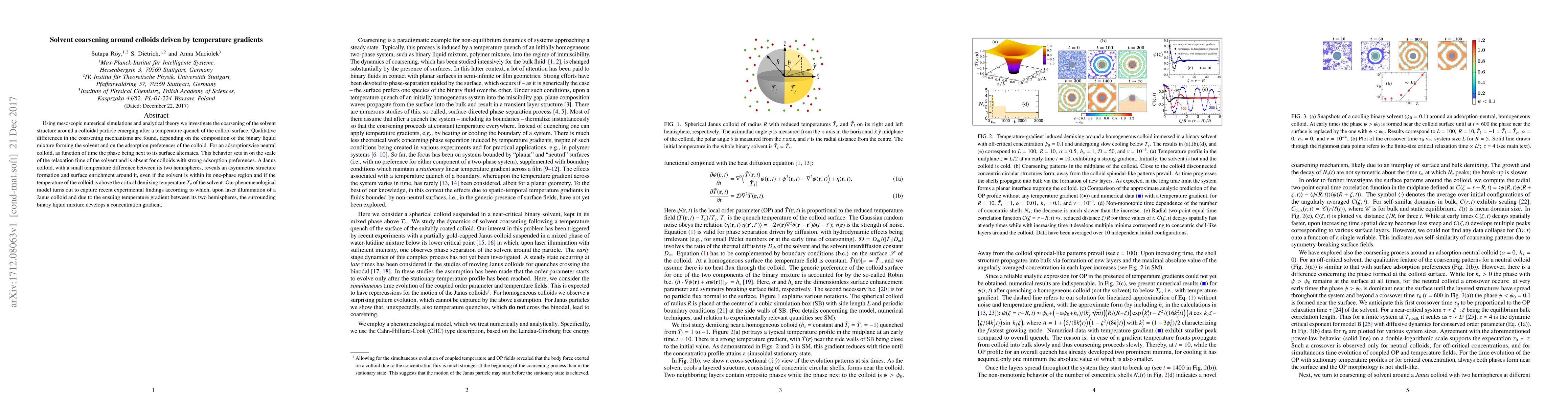 This paper explores solvent coarsening mechanisms around colloids driven by temperature gradients using simulations and theory. It finds that the coarsening behavior varies with the solvent's composition and colloid adsorption preferences, leading to alternating phases near neutral colloids and asymmetric structures around Janus colloids.