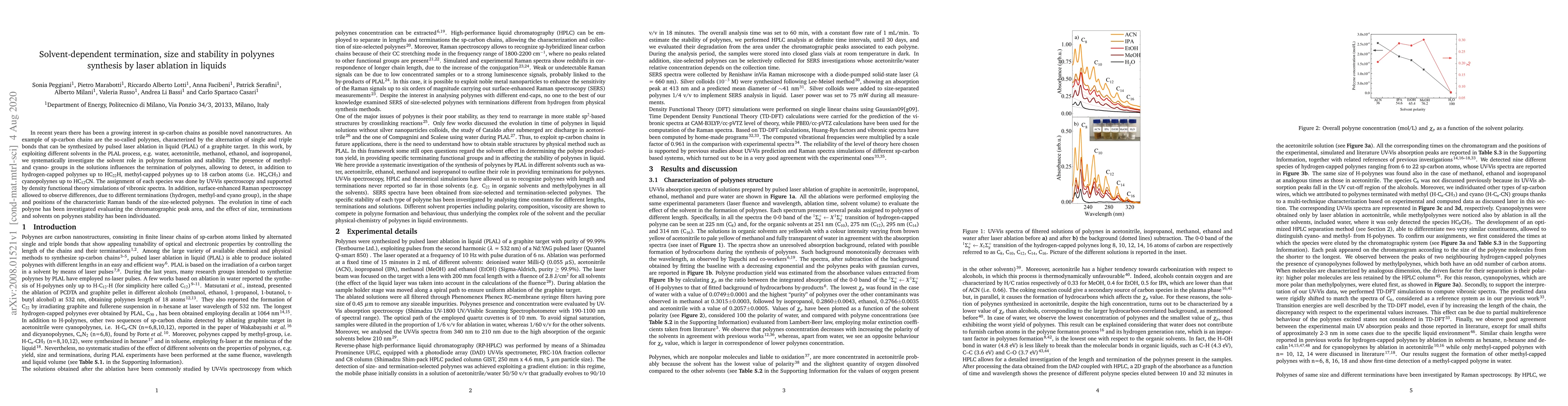 This paper investigates the synthesis of polyynes via pulsed laser ablation in liquid (PLAL) using various solvents, finding that solvent choice influences polyyne termination, size, and stability. The study identifies hydrogen-, methyl-, and cyano-capped polyynes using UV-Vis spectroscopy and density functional theory, and assesses stability through chromatographic peak area analysis.