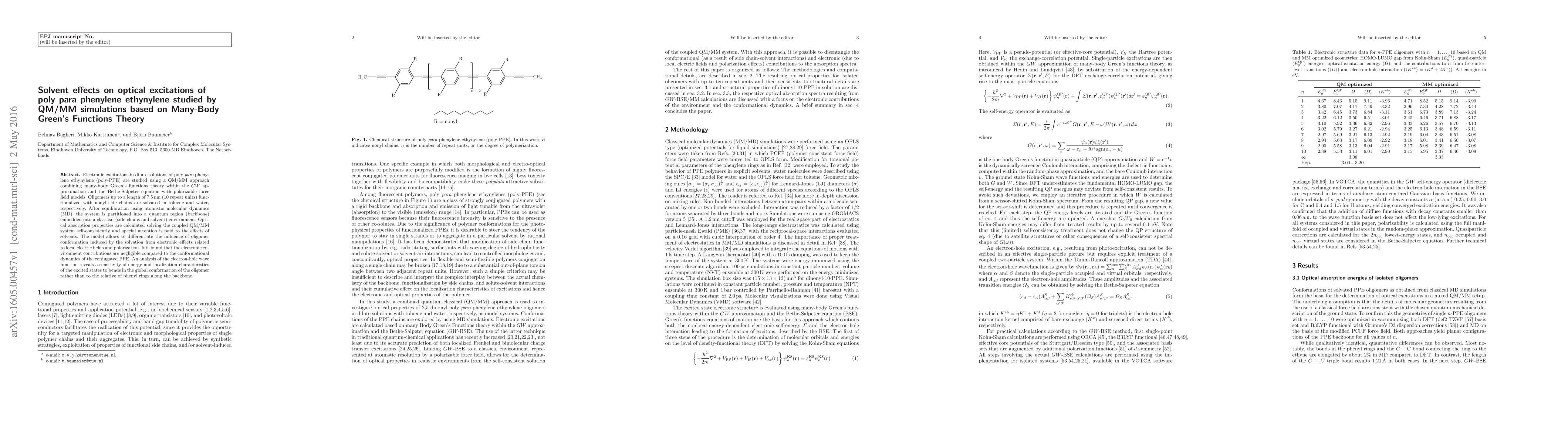 Electronic excitations in dilute solutions of poly para phenylene ethynylene (poly-PPE) are studied using a QM/MM approach combining many-body Green's functions theory within the $GW$ approximation and the Bethe-Salpeter equation with polarizable force field models. Oligomers up to a length of 7.5\,nm (10 repeat units) functionalized with nonyl side chains are solvated in toluene and water, respectively. After equilibration using atomistic molecular dynamics (MD), the system is partitioned into a quantum region (backbone) embedded into a classical (side chains and solvent) environment. Optical absorption properties are calculated solving the coupled QM/MM system self-consistently and special attention is paid to the effects of solvents. The model allows to differentiate the influence of oligomer conformation induced by the solvation from electronic effects related to local electric fields and polarization. It is found that the electronic environment contributions are negligible compared to the conformational dynamics of the conjugated PPE. An analysis of the electron-hole wave function reveals a sensitivity of energy and localization characteristics of the excited states to bends in the global conformation of the oligomer rather than to the relative of phenyl rings along the backbone.