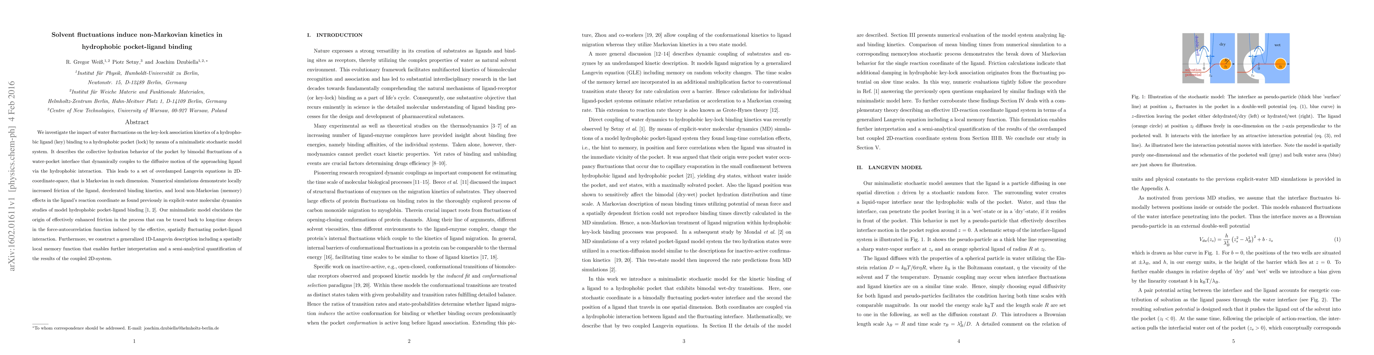 This research explores how water fluctuations influence the binding kinetics of hydrophobic ligands to pockets, revealing enhanced friction and non-Markovian effects through a minimalistic stochastic model. The study finds that these effects arise from long-time decays in the force-autocorrelation function due to fluctuating pocket-ligand interactions.