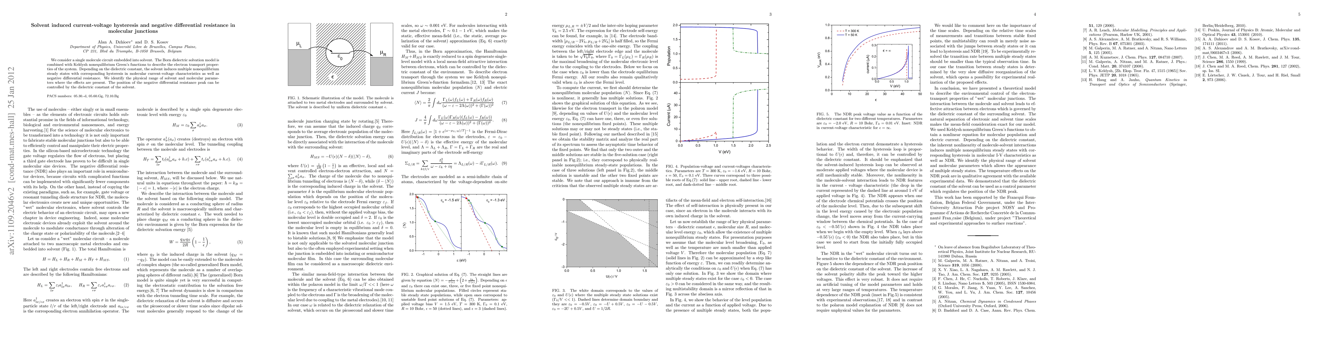 This research investigates electron transport in molecular junctions immersed in solvents, revealing solvent-induced current-voltage hysteresis and negative differential resistance through a combined Born dielectric solvation and Keldysh nonequilibrium Green's function approach. The dielectric constant of the solvent can control the position of the negative differential resistance peak.