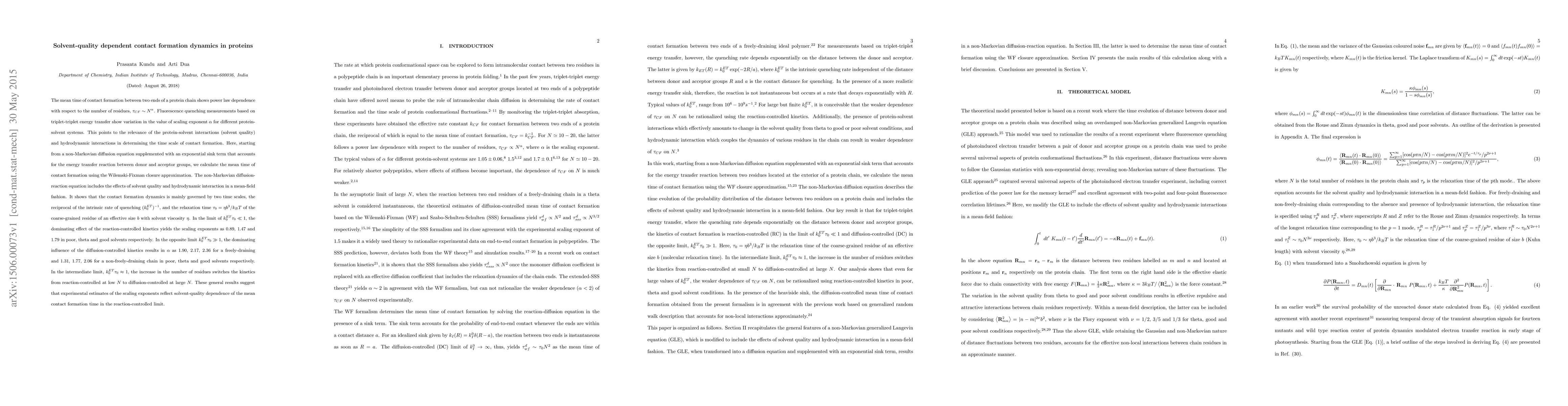 The mean time of contact formation between two ends of a protein chain shows power law dependence with respect to the number of residues, $\tau_{CF} \sim N^{\alpha}$. Fluorescence quenching measurements based on triplet-triplet energy transfer show variation in the value of scaling exponent $\alpha$ for different protein-solvent systems. Here, starting from a non-Markovian diffusion equation supplemented with an exponential sink term that accounts for the energy transfer reaction between donor and acceptor groups, we calculate the mean time of contact formation using the Wilemski-Fixman closure approximation. The non-Markovian diffusion-reaction equation includes the effects of solvent quality and hydrodynamic interaction in a mean-field fashion. It shows that the contact formation dynamics is mainly governed by two time scales, the reciprocal of the intrinsic rate of quenching $(k_0^{ET})^{-1}$, and the relaxation time $\tau_0 = \eta b^3/k_B T$ of the coarse-grained residue of an effective size $b$ with solvent viscosity $\eta$. In the limit of $k_0^{ET} \tau_0 \ll 1$, the dominating effect of the reaction-controlled kinetics yields the scaling exponents as $0.89$, $1.47$ and $1.79$ in poor, theta and good solvents respectively. In the opposite limit $k_0^{ET} \tau_0 \gg 1$, the dominating influence of the diffusion-controlled kinetics results in $\alpha$ as $1.90$, $2.17$, $2.36$ for a freely-draining and $1.31$, $1.77$, $2.06$ for a non-freely-draining chain in poor, theta and good solvents respectively. In the intermediate limit, $k_0^{ET} \tau_0 \approx 1$, the increase in the number of residues switches the kinetics from reaction-controlled at low $N$ to diffusion-controlled at large $N$. These general results suggest that experimental estimates of the scaling exponents reflect solvent-quality dependence of the mean contact formation time in the reaction-controlled limit.