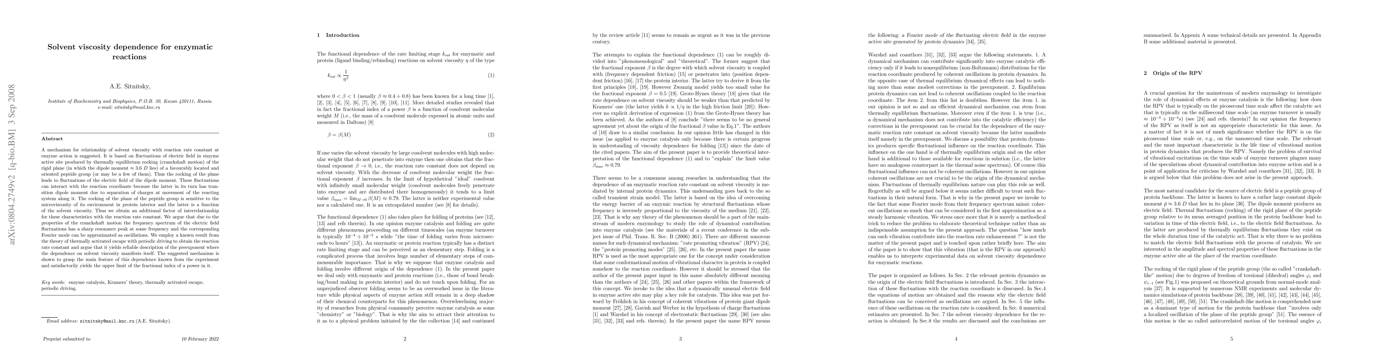 This paper proposes a mechanism linking solvent viscosity to enzymatic reaction rates through electric field fluctuations caused by the rocking motion of peptide groups in the enzyme's active site. It suggests that these fluctuations resonate at a specific frequency, influencing the reaction rate constant and providing a theoretical basis for the observed viscosity dependence.