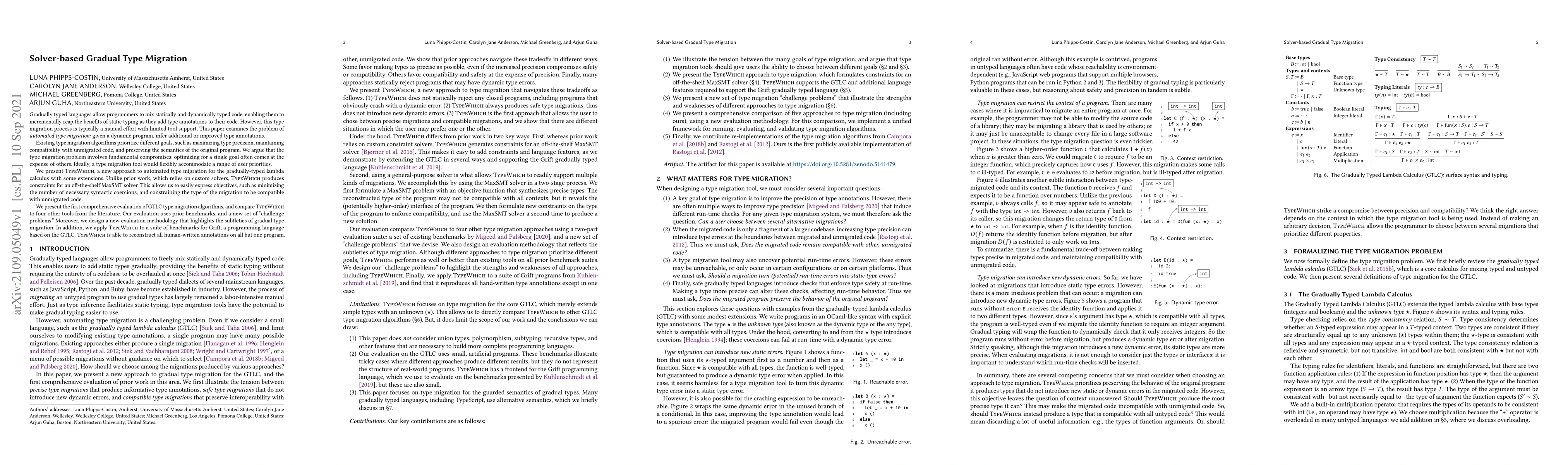 Gradually typed languages allow programmers to mix statically and dynamically typed code, enabling them to incrementally reap the benefits of static typing as they add type annotations to their code. However, this type migration process is typically a manual effort with limited tool support. This paper examines the problem of \emph{automated type migration}: given a dynamic program, infer additional or improved type annotations. Existing type migration algorithms prioritize different goals, such as maximizing type precision, maintaining compatibility with unmigrated code, and preserving the semantics of the original program. We argue that the type migration problem involves fundamental compromises: optimizing for a single goal often comes at the expense of others. Ideally, a type migration tool would flexibly accommodate a range of user priorities. We present TypeWhich, a new approach to automated type migration for the gradually-typed lambda calculus with some extensions. Unlike prior work, which relies on custom solvers, TypeWhich produces constraints for an off-the-shelf MaxSMT solver. This allows us to easily express objectives, such as minimizing the number of necessary syntactic coercions, and constraining the type of the migration to be compatible with unmigrated code. We present the first comprehensive evaluation of GTLC type migration algorithms, and compare TypeWhich to four other tools from the literature. Our evaluation uses prior benchmarks, and a new set of ``challenge problems.'' Moreover, we design a new evaluation methodology that highlights the subtleties of gradual type migration. In addition, we apply TypeWhich to a suite of benchmarks for Grift, a programming language based on the GTLC. TypeWhich is able to reconstruct all human-written annotations on all but one program.